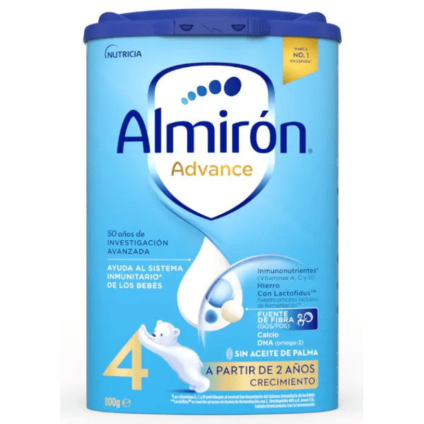 https://www.mifarma.eu/almiron-advance-4-800g980985185268Almirón Advance 4 Growing-Up Milk 800 gr<p><span style="font-weight: bold;">Almirón Advance 4 Growing-Up Milk 800 gr</span></p><p> Almirón Advance 4 Growing-Up Milk is a <span style="font-weight: bold;">formula specifically designed for children from 24 months onwards</span> , providing complete and balanced nutrition at this key stage of growth.</p><p> Developed under an advanced manufacturing process, <span style="font-weight: bold;">this powdered milk includes Pronutra-ADVANCE, a unique combination of ingredients that support physical and cognitive development.</span></p><p> This formula is <span style="font-weight: bold;">rich in essential nutrients, such as calcium and iron</span> , which are vital for bone growth and strengthening, as well as for proper development of the immune system, thanks to <span style="font-weight: bold;">vitamins C and D.</span></p><p> <span style="font-weight: bold;">In addition, it contains 3'GL, an oligosaccharide similar to those found in breast milk</span> , which contributes to intestinal health and the child's overall well-being.</p><p> With Almirón Advance 4, parents can be sure that their children receive the right nutritional support during this stage of exploration and activity.</p>https://assets.atida.com/transform/e42e9f87-4094-42da-8487-81f397d37e05/Almiron-Advance-4-Leche-de-Crecimiento-800-gr?io=transform:extend,width:250,height:25017.99instock2116.354544454545143.01Almirónhttps://www.mifarma.eu/media/catalog/product/c/6/d/e/c6deb95da3d73248638464de258bf0cca684df71_Almiron_Advance_4_Leche_de_Crecimiento_800_gr.png/Baby and Mom/Feeding/Infant Milk/Baby and Mom/Baby and Mom/Feeding/cyber_monday_pt_int/Mifarma Days NO/Atida Cash 5%/Baby and Mom/Feeding/Infant Milk/Toddler milk2024-09-16T06:26:57+0000