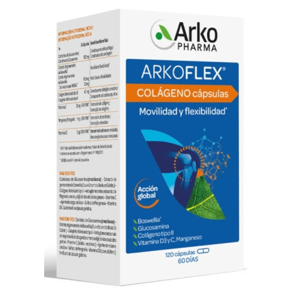 https://www.mifarma.eu/arkopharma-arkoflex-100-joints-120-capsules434362318813Arkopharma Arkoflex Collagen 120 Capsules<p><span style="font-size: 13px; font-weight: 700;">Arkopharma Arkoflex Collagen 120 Capsules</span></p><p> Dietary supplement indicated for people who suffer from <span style="font-weight: bold;">chronic joint pain or discomfort.</span></p><p> Promotes <span style="font-weight: bold;">comprehensive care of joints, bones, cartilage, ligaments, tendons and muscles.</span></p><p> It is formulated with <span style="font-weight: bold;">Vitamin C,</span> which contributes to the <span style="font-weight: bold;">formation of collagen,</span> and <span style="font-weight: bold;">Vitamin D3,</span> which maintains <span style="font-weight: bold;">bones and muscles in normal condition.</span></p><p> In addition, <span style="font-weight: bold;">Manganese</span> contributes to the <span style="font-weight: bold;">normal formation of connective tissue.</span></p><p> Its complete formula also contains highly concentrated <span style="font-weight: bold;">Boswellia</span> extract, which promotes joint mobility, as well as <span style="font-weight: bold;">Glucosamine and hydrolyzed collagen type II.</span></p><p> Recommended for adults and adolescents <span style="font-weight: bold;">aged 15 and over.</span></p>https://assets.atida.com/transform/14a065bd-fd64-43ea-9b36-cdd8d2bb6720/Arkopharma-Arkoflex-Colageno-120-Capsulas?io=transform:extend,width:250,height:25031.99instock44.229.0818171818182812.21Arkopharmahttps://www.mifarma.eu/media/catalog/product/f/a/6/7/fa67900a10c4d4a09322090e75d691164ad952da_Arkopharma_Arkoflex_Colageno_120_Capsulas.png/Atida Cash 5%/Vitamins and Supplements/Bones, Joints, and Muscles/Up to 70% off/Vitamins and Supplements2024-09-16T05:57:00+0000
