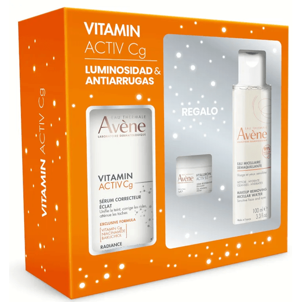 https://www.mifarma.eu/avene-vit-cg-serum-30-ml-micellar-water-100-ml-mini-size-cream921021864394Avène Vit Cg Serum 30 ml + Micellar Water 100 ml + Mini Size Cream<p><span>Avène Vit Cg Serum 30 ml + Micellar Water 100 ml + Mini Size Cream</span></p><p> Facial serum that focuses on <span>correcting, brightening and rejuvenating</span> your skin.</p><p> Thanks to its formula enriched with three dermatological active ingredients, it offers visible and long-lasting results.</p><p> Enriched with 1.8% Vitamin Cg, recognized for its antioxidant effectiveness, equivalent to 20% vitamin C, this serum helps combat the signs of aging and provides instant luminosity to your skin.</p><p> It contains 3% Niacinamide, which lastingly regenerates the skin and reduces the appearance of spots, and 1.5% Bakuchiol, a plant ingredient that corrects wrinkles and acts as an alternative to retinol.</p><p> With its combination of powerful active ingredients, this serum not only brightens your skin, but also smoothes and plumps it by 95%.</p><p> After a month of use, you will see a significant reduction in stains.</p><p> Contains <span>94% ingredients of natural origin</span> .</p><p> Suitable for <span>all skin types</span> , even sensitive.</p><p></p><p> In addition, its practical glass container with pipette guarantees precise and easy application.</p><p> The pack includes a <span>GIFT</span> of micellar water and a mini size of the cream from the Hyaluron Activ B3 range.</p>https://assets.atida.com/transform/303f6f37-e4e3-4130-92e3-c4a3322b30bf/Avene-Vit-Cg-Serum-30-ml-Agua-Micelar-100-ml-Minitalla-Crema?io=transform:extend,width:250,height:25031.99outofstock50.1126.4380155289263618.12Avenehttps://www.mifarma.eu/media/catalog/product/2/0/c/e/20ce1cb67f08de50932ee51f67791d617e1a271b_Product_Tile_Thumbnail_Avene_Vit_Cg_Serum_30_ml_Agua_Micelar_100_ml_Minitalla_Crema.png/Cosmetics and Beauty/Cosmetics and Beauty/Facial/Cosmetics and Beauty/Facial/Serum/Gifts/Gift Sets for Her/Gifts/Gifts/For Her/Up to 70% off/Singles' Day: Up to 70% off!2024-09-16T06:23:42+0000