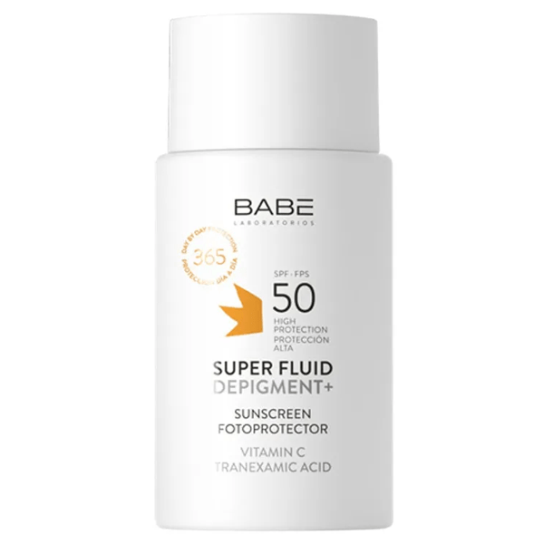 https://www.mifarma.eu/babe-super-fluid-depigment-spf50-50-ml771935499640Babe Super Fluid Depigment+ SPF50 50 ml<p><span>Babe Super Fluid Depigment+ SPF 50 50 ml<br></span></p><p> This facial sunscreen SPF 50 carries out a <span>depigmenting action</span> on the skin.</p><p> Prevents the appearance of <span>spots</span> caused by the sun and reduces the appearance of existing ones.</p><p> Formula with Vitamin C and Tranexamic Acid that reduces spots, lightens and evens skin tone.</p><p> It also provides protection against infrared rays, the blue light emitted by screens and mobile devices, and pollution.</p><p> Waterproof.</p><p> It does not itch in the eyes.</p><p></p><p> Its fluid texture spreads and absorbs easily.</p><p> Ideal for daily use.</p>https://assets.atida.com/transform/1f38af84-5a19-49be-9aaa-4ba5d0e78958/Babe-Super-Fluid-Depigment-SPF50-50-ml?io=transform:extend,width:250,height:25017.99instock24.2114.867767595041266.22Babehttps://www.mifarma.eu/media/catalog/product/a/a/4/5/aa4595bbe330187b28b8f8d2b967f39640d32fe2_Babe_Super_Fluid_Depigment_SPF50_50_ml.png/Atida Cash 5%/Cosmetics and Beauty/Cosmetics and Beauty/Facial/Cosmetics and Beauty/Facial/Dark spot corrector/cyber_monday_pt_int/Up to 70% off/Health and Hygiene2024-09-16T06:15:32+0000