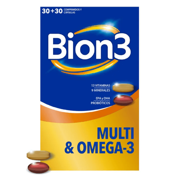 https://www.mifarma.eu/bion3-multi-and-omega-3-30-tablets-30-capsules314779065261Bion3 Multi & Omega-3 30 Tablets + 30 Capsules<p><span style="font-weight: bold;">Bion3 Multi & Omega-3 30 Tablets + 30 Capsules</span></p><p> <span style="font-weight: bold;">Bion3 Multi & Omega-3 with Probiotics</span> is a food supplement specifically designed for adults, which integrates a complete formula to promote general well-being.</p><p> This product <span style="font-weight: bold;">stands out for its combination of multivitamin tablets that provide 13 essential vitamins and 9 minerals</span> , helping to maintain mental and physical energy throughout the day. Among the vitamins present are <span style="font-weight: bold;">vitamin C</span> , which supports the immune system, and magnesium, which helps reduce tiredness and fatigue.</p><p> <span style="font-weight: bold;">Omega-3 capsules contain EPA and DHA fatty acids</span> , known for their numerous health benefits. According to the European Food Safety Authority (EFSA), <span style="font-weight: bold;">DHA</span> <span style="font-weight: bold;">contributes to normal brain function and is essential for eye health</span> . <span style="font-weight: bold;">EPA and DHA, in turn, are essential for maintaining a healthy heart</span> , a vital aspect of cardiovascular health.</p><p> <span style="font-weight: bold;">A distinctive aspect of Bion3 Multi & Omega-3 is its probiotic content, specifically Bacillus subtilis DE111</span> , which provides 1 billion units that reach the intestine alive, thus promoting <span style="font-weight: bold;">digestive health</span> .</p><p> This approach not only supports the gut flora, but also contributes to better nutrient absorption, which is crucial for optimizing the body's functioning.</p>https://assets.atida.com/transform/d7493c22-ef3d-4747-9f98-0d1091d3f3d5/Bion3-Multi-Omega-3-30-comprimidos-30-capsulas?io=transform:extend,width:250,height:25020.99outofstock25.4919.081817181818184.5Bion3https://www.mifarma.eu/media/catalog/product/b/b/5/e/bb5e444019dc12d3651b1dfd06a5bb4de2aeebea_Bion3_Multi_Omega_3_30_comprimidos_30_capsulas.png/Vitamins and Supplements/Supplements/Digestive System/Vitamins and Supplements/Vitamins and Supplements/Multivitamins/Vitamins and Supplements/Probiotics/Vitamins and Supplements/Supplements2025-12-04T00:51:22+0000