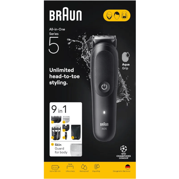 The Braun Series 5 AIO5540 All-in-One is the ultimate styling kit for the modern man. With 9 functions in 1 , this set lets you trim, edge, and shave your beard, hair, ears, nose, and body with total precision , easily adapting to your style.