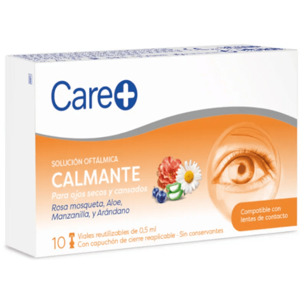 https://www.mifarma.eu/care-soothing-ophthalmic-solution-10-vials169885868314Care+ Soothing Eye Solution for Irritated Eyes 10 units x 0.5 ml<p><span style="font-weight: bold;">Care+ Soothing Eye Solution for Irritated Eyes 10 units x 0.5 ml</span></p><p> <span style="font-weight: bold;">Care+ Soothing Eye Drops</span> is an ophthalmic solution that provides <span style="font-weight: bold;">immediate relief and advanced protection for irritated, tired or dry eyes.</span></p><p> Its unique formula, enriched with <span style="font-weight: bold;">chamomile, eyebright and witch hazel,</span> helps to <span style="font-weight: bold;">soothe and refresh the eyes,</span> effectively combating <span style="font-weight: bold;">redness, fatigue and discomfort caused by multiple environmental and lifestyle factors</span> .</p><p> In addition, <span style="font-weight: bold;">hyaluronic acid and hypromellose</span> create a <span style="font-weight: bold;">transparent, viscoelastic protective shield</span> over the ocular surface, providing <span style="font-weight: bold;">long-lasting hydration and protection against dryness.</span></p><p> <span style="font-weight: bold;">Rosehip, aloe vera and cranberry</span> provide <span style="font-weight: bold;">soothing, antiseptic and antioxidant</span> properties that help <span style="font-weight: bold;">repair and protect against UV radiation.</span></p><p> This product comes in <span style="font-weight: bold;">convenient sterile, preservative-free vials</span> , ensuring maximum hygiene and making it <span style="font-weight: bold;">compatible with contact lens use</span> , restoring comfort and eye well-being anytime, anywhere.</p>https://assets.atida.com/transform/7a770d1e-21f8-4b22-abd7-b3948e781c81/Care-Solucion-Ofalmica-Calmante-Ojo-Irritado-10-uds-x-0-5-ml?io=transform:extend,width:250,height:2506.99instock8.25.7768585041322151.21Careplushttps://www.mifarma.eu/media/catalog/product/d/6/2/1/d62199ddb4ada5099732be0fc7aa7ed1bdb8b1ba_Care_Solucion_Ofalmica_Calmante_Ojo_Irritado_10_uds_x_0_5_ml.png/Health and Hygiene/Optics/Eye Drops and Physiological Serums/Health and Hygiene/Optics/Contact Lens Liquid and Moisturization/Health and Hygiene/Health and Hygiene/Optics2025-02-11T00:42:03+0000