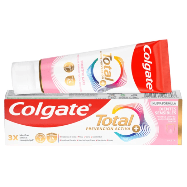 https://www.mifarma.eu/colgate-total-advanced-sensitive-complete-protection-toothpaste-75-ml281686905934Colgate Total Toothpaste Active Prevention Sensitive Teeth 75 ml<p><span style="font-weight: bold;">Colgate Total Toothpaste Active Prevention Sensitive Teeth 75 ml</span></p><p> Toothpaste designed to offer active prevention and comprehensive protection for oral health. Its advanced formula is <span style="font-weight: bold;">three times more effective at combating the root cause of the most common oral problems</span> , while also providing <span style="font-weight: bold;">24-hour antibacterial protection</span> .</p><p> <span style="font-weight: bold;">Especially indicated for those who suffer from tooth sensitivity</span> , it has a fast-acting effect that relieves sensitivity from the first day of use. Its dense foam offers a soft and pleasant experience for sensitive teeth.</p><p> Colgate Total Active Prevention + Sensitive Teeth's patented technology <span style="font-weight: bold;">helps combat 8 key oral health problems:</span></p><p> - Gum problems</p><p> - Dental plaque</p><p> - Tartar</p><p> - Sensitivity</p><p> - Enamel erosion</p><p> - Superficial stains</p><p> - Bad breath</p><p> - Cavities</p><p> With Colgate Total Active Prevention + Sensitive Teeth, your smile stays protected, cared for, and free from discomfort.</p>https://assets.atida.com/transform/aa8e8fe8-29f8-482e-85fe-9c29e1f12943/Colgate-Total-Pasta-de-Dientes-Prevencion-Activa-Dientes-Sensibles-75-ml?io=transform:extend,width:250,height:2503.49instock4.22.8842965206612170.71Colgatehttps://www.mifarma.eu/media/catalog/product/c/d/9/9/cd99d8e1575348cb7b1db80208f2f8280723247d_Colgate_Total_Pasta_de_Dientes_Prevencion_Activa_Dientes_Sensibles_75_ml.png/Health and Hygiene/Dental and Oral Care/Toothpaste/Health and Hygiene/Health and Hygiene/Dental and Oral Care/cyber_monday_pt_int2024-09-16T05:49:23+0000