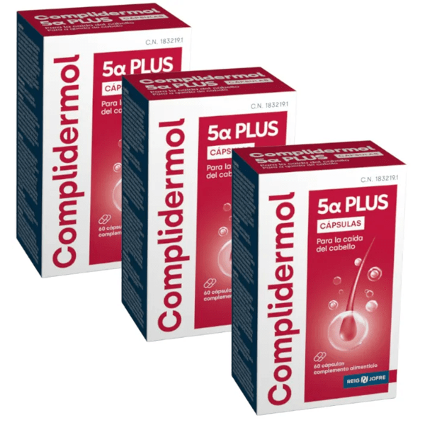 https://www.mifarma.eu/complidermol-5-alfa-plus-3x60-anti-hair-loss-capsules169921908334Complidermol 5 Alfa Plus 3x60 Anti-Hair Loss Capsules<p><span>Complidermol 5 Alfa Plus 3x60 Anti-Hair Loss Capsules</span></p><p> Combats and prevents <strong>hair loss in women</strong> .</p><p> <span>Female androgenetic alopecia</span> currently affects 40% of women over 50 years of age.</p><p></p><p> <strong>BENEFITS</strong></p><p> <strong>- Complidermol 5 Alfa Plus</strong> is a dietary supplement that, thanks to its innovative formulation, addresses the hormonal, oxidative and inflammatory factors of female androgenetic alopecia.</p><p> - It is made from dermoactive substances such as lipid extracts of Pygeum Africanum and Serenoa Repens, Dimethyl Sulfone (MSM), vitamins B3, B5, B6, H and E, Selenium, Iron and Zinc.</p><p> - Slows the progression of hair loss, revitalizes the hair follicle and lengthens the anagen phase of hair growth.</p><p> <strong>- Complidermol 5 Alfa Plus</strong> improves the quality of the affected hair.</p><p> TRIPLE, at the best price!</p>https://assets.atida.com/transform/84d409a4-7a17-467f-8476-67ee0eb95e8a/Complidermol-5-Alfa-Plus-3x60-Capsulas-Anticaida?io=transform:extend,width:250,height:25079.99instock88.3972.718180818182108.4Complidermolhttps://www.mifarma.eu/media/catalog/product/2/6/5/b/265bacf1949db68d8dc07250dd39e543ac9f0472_Complidermol_5_Alfa_Plus_3x60_Capsulas_Anticaida.png/Health and Hygiene/Hair Care/Anti-Hair Loss/Health and Hygiene/Hair Care/Treatment/Mini Prices/Savings Packs/Health and Hygiene/Health and Hygiene/Hair Care/Vitamins and Supplements/Savings Packs/Vitamins and Supplements Packs2024-09-16T05:44:14+0000