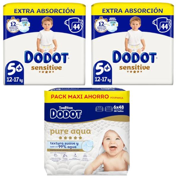 Description ico-chevron-down Dodot Sensitive Extra-Jumbo Diapers Pack T5 2x44 units + Aqua Touch Wipes 288 units