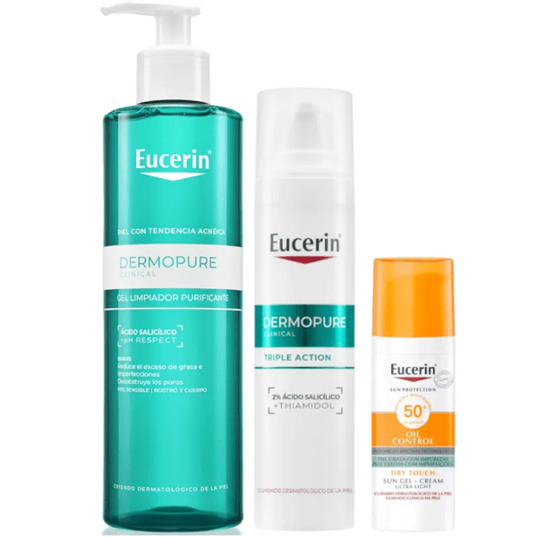 https://www.mifarma.eu/eucerin-dermopure-cleanser-400-ml-serum-40-ml-gel-cream-spf50-50-ml885357836201Eucerin DermoPure Cleanser 400 ml + Serum 40 ml + Gel-Cream SPF50+ 50 ml<p><span style="font-weight: bold;">Eucerin DermoPure Cleanser 400 ml + Serum 40 ml + Gel-Cream SPF50+ 50 ml</span></p><p>This pack of 3 products is suitable to combat acne:</p><p><span style="font-weight: 700;">Eucerin DermoPure Cleanser 400 ml</span></p><p>Cleansing gel for daily skin hygiene oily and blemished.</p><p>Removes excess sebum, dirt and makeup.</p><p>Eliminates bacteria from the skin and prevents bacterial growth.</p><p> Formulated with 6% amphoteric and salicylic acid.</p><p>No soap. Without perfumes. Non-comedogenic.</p><p><span style="font-weight: bold;">Eucerin DermoPure Oil Control Anti-Acne Serum 40 ml</span></p><div><p>Facial serum with triple effect .</p><p>Prevents the appearance of spots.</p><p>Regulates excess sebum, leaving a matte finish.</p><p>Avoids acne blemishes.</p><p >Indicated for skin with imperfections or marks.</p><p><span style="font-weight: bold;">Eucerin Gel-Cream Oil Control Dry Touch SPF50+ 50 ml</span></p><p >SPF50 sunscreen for the face.</p><p>Long-lasting dry and matte finish.</p><p>Protects from broad-spectrum and photostable UVA/UVB rays.</p><p> Indicated for oily or acne-prone skin.</p><p>Ultra-light texture, non-greasy and fragrance-free.</p></div>https://assets.atida.com/transform/7d03a459-575e-4ff4-a403-8c5c78d00a5a/Eucerin-DermoPure-Limpiador-400-ml-Serum-40-ml-Gel-Crema-SPF50-50-ml?io=transform:extend,width:250,height:25045.99instock71.5838.008263462813625.59Eucerinhttps://www.mifarma.eu/media/catalog/product/6/1/4/a/614a84b1de806d77a2b18a6d1e2ca32de3072a20_Eucerin_DermoPure_Limpiador_400_ml_Serum_40_ml_Gel_Crema_SPF50_50_ml.png/Cosmetics and Beauty/Cosmetics and Beauty/Facial/Cosmetics and Beauty/Facial/Acne/Mini Prices/Savings Packs/Cosmetics and Beauty Packs/Savings Packs/Gift Sets for Her/Atida Cash 5%/For Her2024-10-22T23:48:22+0000