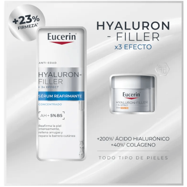 https://www.mifarma.eu/eucerin-hyaluron-filler-firming-serum-30ml-mini-size-day-cream-spf-30-20ml199574123333Eucerin Hyaluron-Filler Firming Serum 30ml + Mini Size Day Cream SPF 30 20ml<p><span style="font-weight: bold;">Eucerin Hyaluron-Filler Firming Serum 30ml + Mini Size Day Cream SPF 30 20ml</span></p><p> This firming serum is an advanced solution designed to address the visible signs of skin aging. This pack includes a travel-size SPF 30 day cream.</p><p> <span style="font-weight: bold;">BENEFITS</span></p><p> Over time, skin loses its firmness and elasticity, resulting in the appearance of wrinkles and fine lines. This product combines 5% provitamin B5 with micro hyaluronic acid, providing intense hydration that penetrates the deepest layers of the skin, helping to visibly fill wrinkles and improve skin texture.</p><p> - Provitamin B5 is known for its regenerative properties, promoting cell renewal and favoring skin that is more resistant to external factors such as pollution and environmental stress.</p><p> - Micro Hyaluronic Acid, for its part, acts as a powerful moisturizer that retains moisture, contributing to a firmer and healthier appearance.</p><p> This serum not only focuses on hydration but also strengthens the skin barrier thanks to ingredients like Glycerin, which acts as a natural moisture magnet, and Symsitiveâ„¢, which provides immediate soothing properties. This is especially beneficial for sensitive or dry skin.</p>https://assets.atida.com/transform/0897c14d-250b-47eb-b3f3-2679454474ff/Eucerin-Hyaluron-Filler-Serum-Reafirmante-30-ml-Minitalla-Dia-FPS-30-20-ml?io=transform:extend,width:250,height:25031.99instock39.9926.438015528926208Eucerinhttps://www.mifarma.eu/media/catalog/product/a/b/a/1/aba1a78b1e14a643d6732161d151fb0ee17ce3a5_Eucerin_Hyaluron_Filler_Serum_Reafirmante_30_ml_Minitalla_Dia_FPS_30_20_ml.png/Cosmetics and Beauty/Cosmetics and Beauty/Facial/Cosmetics and Beauty/Facial/Serum/Mifarma Days NO2026-01-09T00:48:13+0000