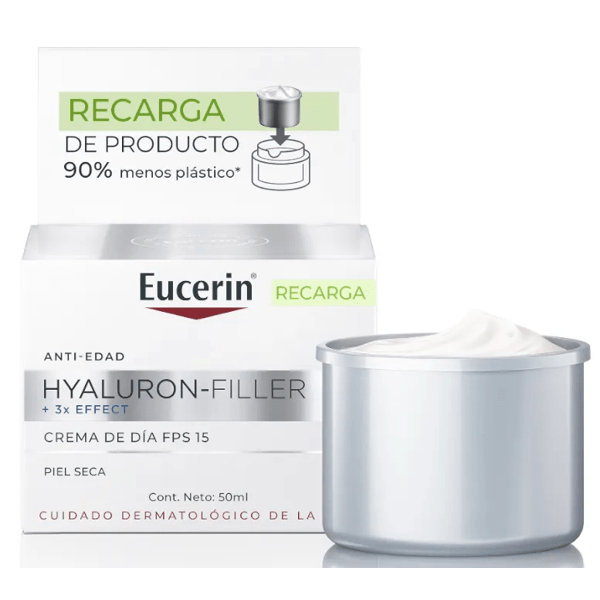 https://www.mifarma.eu/eucerin-hyaluron-filler-triple-effect-cream-spf15-dry-skin-recharge-50-ml179490327068Eucerin Hyaluron-Filler Triple Effect Cream SPF15 Dry Skin Recharge 50 ml<p><span>Eucerin Hyaluron-Filler Day SPF15 Dry Skin Replacement 50 ml<br></span></p><p> This Hyaluron-Filler Day SPF 15 refill for dry skin can be used in combination with any bottle of Eucerin Facial Care. It is estimated that the replacement parts save more than 16 tons of plastic per year*.</p><p> Day cream specially designed to repair and combat <span>wrinkles</span> and expression lines.</p><p> The <span>Hyaluron-Filler innovation</span> carries out a <span>Triple Effect</span> on the skin:</p><p> 1. Fills expression lines and deep wrinkles from the inside.</p><p> 2. Stimulates more than 200% the synthesis of hyaluronic acid and more than 49% the synthesis of collagen.</p><p> 3. Protects the degradation of hyaluronic acid by more than 50%.</p><p> <span>BENEFITS</span></p><p> - Its innovative formula with Hyaluronic Acid and Saporin provides a visible wrinkle filling effect instantly and long-lasting.</p><p> - Stops signs of aging in the skin of the face and neck.</p><p> - Reactivates the skin s natural Hyaluronic Acid production by 256% to fill wrinkles, even the deepest ones, from the inside.</p><p> - Hyaluronic Acid restores skin volume to visibly reduce wrinkles.</p><p> - Bioactive Saporin acts in the deepest layers of the skin to stimulate the natural synthesis of Hyaluronic Acid.</p><p> - With sun protection factor SPF15.</p><p> <span>WHO IS IT INTENDED FOR?</span></p><p> It is recommended for the care of <span>dry skin</span> .</p><p> *Annual savings based on 1-year internal volume forecast.</p>https://assets.atida.com/transform/b68abec6-bd5b-4982-9bc5-83036c33564f/Eucerin-Refill-HF-SPF-15-Dia-Piel-Seca?io=transform:extend,width:250,height:25027.99outofstock41.8423.1322304049593313.85Eucerinhttps://www.mifarma.eu/media/catalog/product/c/d/7/7/cd77095511fcdb962a3afd2ca90e0046d43320fb_Eucerin_Refill_HF_SPF_15_Dia_Piel_Seca.png/Atida Cash 5%/Cosmetics and Beauty/Cosmetics and Beauty/Facial/Cosmetics and Beauty/Facial/Anti-Wrinkle Creams/cyber_monday_pt_int/Up to 70% off/Mifarma Days NO/NO MIFARMA DAYS/Singles' Day: Up to 70% off!2024-09-16T05:44:44+0000