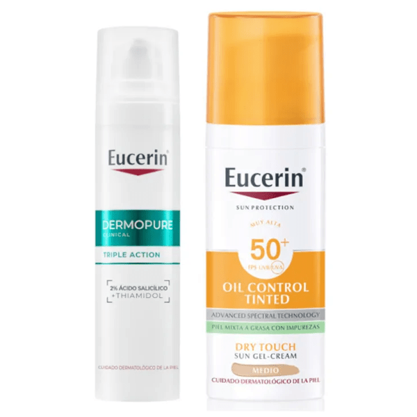 This Eucerin brand pack is specially indicated to combat acne marks , and consists of a facial serum and a tinted SPF 50+ sunscreen, ideal for daily use.