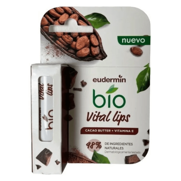 https://www.mifarma.eu/eudermin-bio-vital-lips-lip-balm-cocoa-butter-1-unit156521183684Eudermin Bio Vital Lips Lip Balm Cocoa Butter 1 unit<p><span style="font-weight: bold;">Eudermin Bio Vital Lips Lip Balm Cocoa Butter 1 unit</span></p><p> Lip balm in stick format, with cocoa butter to intensely nourish the lips.</p><p> <span style="font-weight: bold;">BENEFITS</span></p><p> - The formula contains <span style="font-weight: bold;">98% ingredients of natural origin</span> .</p><p> - Cocoa butter, known for its emollient properties, works effectively to revitalize the lips, providing lasting softness and a prolonged feeling of comfort.</p><p> This key ingredient not only nourishes but also helps restore skin elasticity, which is essential for maintaining lips in optimal condition.</p><p> - It prevents dryness and cracking, a common problem that can arise due to environmental factors such as cold or wind.</p>https://assets.atida.com/transform/b29836d4-0b47-4e02-931d-a6dfd84bf79e/Eudermin-Bio-Vital-Lips-Balsamo-Labial-Mateca-de-Cacao-1-ud?io=transform:extend,width:250,height:2502.49instock2.692.057850239669470.2Euderminhttps://www.mifarma.eu/media/catalog/product/f/8/6/e/f86ee85bf5ff8e210a3a3c3d39882bee55199051_Eudermin_Bio_Vital_Lips_Balsamo_Labial_Mateca_de_Cacao_1_ud.png/Cosmetics and Beauty/Cosmetics and Beauty/Facial/Cosmetics and Beauty/Facial/Lips2026-03-17T00:48:03+0000