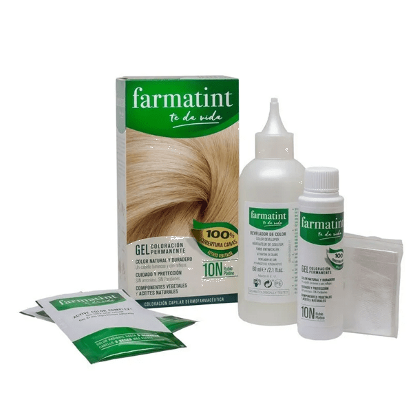 https://www.mifarma.eu/farmatint-permanent-coloring-gel-10n-platinum-blonde-135-ml357604697477Farmatint Permanent Coloring Gel 10N Platinum Blonde 135 ml<p>Farmatint, thanks to its gentle combination without ammonia and the active vegetable ingredients it contains, perfectly covers gray hair while caring for the hair.<br></p><p>Formulated with oats, wheat, soy and corn, nourishes and protects hair during the coloring process.