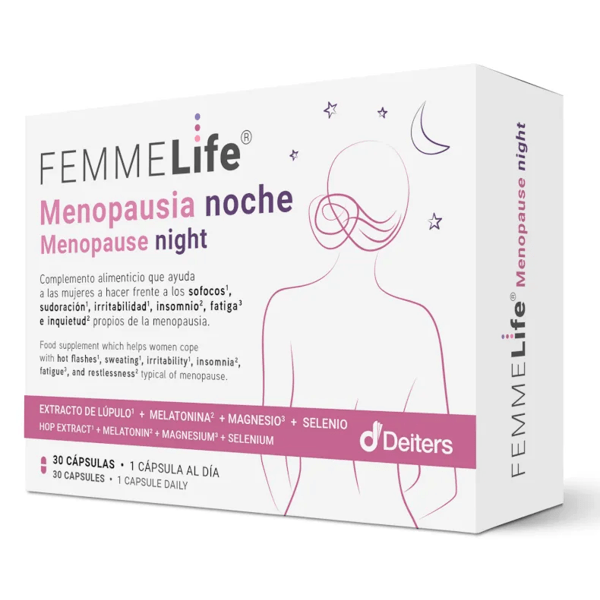 https://www.mifarma.eu/femmelife-menopause-night-30-capsules929396192612FEMMELife Menopause Night 30 Capsules<p><span style="font-size: 13px; font-weight: bold;">FEMMELife Menopause Night 30 Capsules</span></p><p> This dietary supplement has been formulated with <span style="font-weight: bold;">the well-being of women during menopause in mind.</span></p><p> With a unique combination of ingredients, it is specially designed to provide effective relief from the most common challenges of this period: <span style="font-weight: bold;">hot flashes, excessive sweating, difficulty sleeping, restlessness, and irritability.</span></p><p> In addition, it helps <span style="font-weight: bold;">reduce fatigue and protects cells from damage caused by oxidative stress,</span> thus supporting a <span style="font-weight: bold;">more active and healthy lifestyle.</span></p><p> Experience each phase of your menopause with serenity and control, thanks to this essential ally for your well-being.</p>https://assets.atida.com/transform/a6ae6f39-23d6-4107-a79a-207b8267cc7b/FEMMELife-Menopausia-Noche-30-Capsulas?io=transform:extend,width:250,height:25011.99instock13.3410.899999101.35FEMMELifehttps://www.mifarma.eu/media/catalog/product/2/3/0/7/23077cfc12aaa5ea25e327528d1118b8122dd73a_FEMMELife_Menopausia_Noche_30_Capsulas.png/Health and Hygiene/Health and Hygiene/Women’s Health/Vitamins and Supplements/Vitamins and Supplements/Supplements/Health and Hygiene/Women’s Health/Menopause2025-10-11T00:12:48+0000