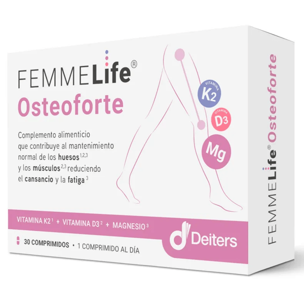 https://www.mifarma.eu/femmelife-osteoforte-30-tablets688100510059FEMMELife Osteoforte 30 Tablets<p><span style="font-size: 13px; font-weight: bold;">FEMMELife Osteoforte 30 Tablets</span></p><p> Discover <span style="font-weight: bold;">the power of the synergy between vitamin D3, vitamin K2, and magnesium</span> in a unique formula designed to <span style="font-weight: bold;">support your skeleton and muscles,</span> keeping you active and energetic.</p><p> <span style="font-weight: bold;">- Vitamin D3</span> is crucial for <span style="font-weight: bold;">facilitating the absorption of calcium and phosphorus,</span> essential elements that <span style="font-weight: bold;">regulate blood calcium levels and promote optimal bone health.</span></p><p> <span style="font-weight: bold;">- Vitamin K2</span> is directly involved in <span style="font-weight: bold;">calcium retention in bones</span> and ensures that it is not deposited in arteries or soft tissues, thus preventing unwanted calcification.</p><p> <span style="font-weight: bold;">- Magnesium</span> , for its part, is a master at <span style="font-weight: bold;">regulating calcium homeostasis</span> and, along with its properties for <span style="font-weight: bold;">strengthening bone strength,</span> helps you say goodbye to tiredness and fatigue.</p><p> This product is ideal for those looking <span style="font-weight: bold;">to take care of their bone and muscle structure,</span> staying active and full of energy.</p>https://assets.atida.com/transform/2b7c75a7-5685-4d57-b097-719b61c3845b/FEMMELife-Osteoforte-30-Comprimidos?io=transform:extend,width:250,height:2508.99instock9.668.172726272727370.67FEMMELifehttps://www.mifarma.eu/media/catalog/product/8/6/c/9/86c936cf6f01eeddbc1f1df14d29df33a7a5e2a4_FEMMELife_Osteoforte_30_Comprimidos.png/Vitamins and Supplements/Supplements/Bones, Joints, and Muscles/Vitamins and Supplements/Vitamins and Supplements/Minerals/Vitamins and Supplements/Supplements/Vitamins and Supplements/Vitamins (A-K)2025-10-11T00:04:50+0000