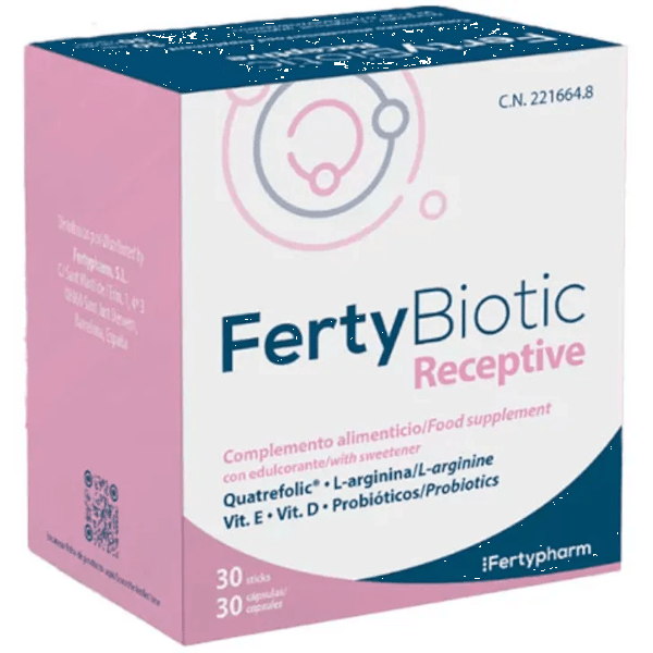 https://www.mifarma.eu/fertybiotic-receptive-30-sticks-30-capsules607642400507FertyBiotic Receptive 30 Sticks + 30 Capsules<p><span style="font-weight: bold;">FertyBiotic Receptive 30 Sticks + 30 Capsules</span></p><p> <span style="font-weight: 700;">FertyBiotic Receptive</span> is a food supplement designed to <span style="font-weight: bold;">effectively support reproductive health</span> .</p><p> This product stands out for its <span style="font-weight: bold;">advanced formulation that includes Quatrefolic</span> , an active form of <span style="font-weight: bold;">folic acid</span> characterized by its <span style="font-weight: bold;">excellent bioavailability</span> , thus guaranteeing better absorption and utilization by the body.</p><p> The inclusion of <span style="font-weight: bold;">L-arginine</span> is essential, as this amino acid helps <span style="font-weight: bold;">improve blood circulation,</span> which is crucial for reproductive health and overall well-being.</p><p> In addition, it contains <span style="font-weight: bold;">vitamins E and D,</span> which play a key role in various bodily functions.</p><p> <span style="font-weight: bold;">- Vitamin E</span> is known for its <span style="font-weight: bold;">antioxidant properties,</span> contributing to the protection of cells against oxidative damage.</p><p> <span style="font-weight: bold;">- Vitamin D</span> is essential for <span style="font-weight: bold;">regulating the immune system and calcium absorption,</span> which promotes <span style="font-weight: bold;">bone and muscle health.</span></p>https://assets.atida.com/transform/862d6ae8-99b8-47da-9163-119e14e8afb5/FertyBiotic-Receptive-30-Sticks-30-Capsulas?io=transform:extend,width:250,height:25067.99outofstock79.9961.8090899090911512Fertypharmhttps://www.mifarma.eu/media/catalog/product/9/f/8/0/9f80bb680caa9e1cb5bab7e706739a91c7713e01_FertyBiotic_Receptive_30_Sticks_30_Capsulas.png/Vitamins and Supplements/Supplements/Bones, Joints, and Muscles/Health and Hygiene/Health and Hygiene/Women’s Health/Vitamins and Supplements/Vitamins and Supplements/Minerals/Vitamins and Supplements/Supplements/Vitamins and Supplements/Vitamins (A-K)/Health and Hygiene/Women’s Health/Fertility Supplements2026-03-18T01:12:20+0000