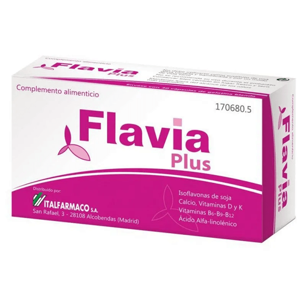 https://www.mifarma.eu/flavia-plus-30-capsules241940372062Flavia Plus Menopause 30 Capsules<p><span style="font-weight: bold;">Flavia Plus Menopause 30 Capsules</span></p><p> Food supplement that has all the active ingredients necessary to help women during <strong>menopause</strong> .<br></p><p> With soy isoflavones, Calcium, Vitamins D and K and alpha-linolenic acid.</p><p> <span style="font-weight: bold;">Isoflavones</span> are plant hormones with a structure very similar to that of female hormones.</p><p> <span style="font-weight: bold;">Calcium</span> helps maintain normal bones, while <span style="font-weight: bold;">vitamins D and K</span> help calcium bind to bones.</p><p> <span style="font-weight: bold;">Folates, vitamins B6 and B12</span> contribute to normal homocysteine metabolism, as well as regulating hormonal activity.</p><p> In addition, alpha-linolenic acid contributes to maintaining normal blood cholesterol levels.</p>https://assets.atida.com/transform/beba8dcf-6e30-43c5-97aa-17d0c8e51ff6/Flavia-Plus-Menopausia-30-Capsulas?io=transform:extend,width:250,height:25018.99instock21.8217.263635363636132.83Flaviahttps://www.mifarma.eu/media/catalog/product/1/3/2/3/132346a37a14d0df31e2d1b8abaf0e9ce7cbcd48_Flavia_Plus_Menopausia_30_Capsulas.png/Mini Prices/Health and Hygiene/Health and Hygiene/Women’s Health/Vitamins and Supplements/Vitamins and Supplements/Minerals/Vitamins and Supplements/Vitamins (A-K)/Health and Hygiene/Women’s Health/Fertility Supplements/Health and Hygiene/Women’s Health/Menopause2024-09-16T05:47:31+0000