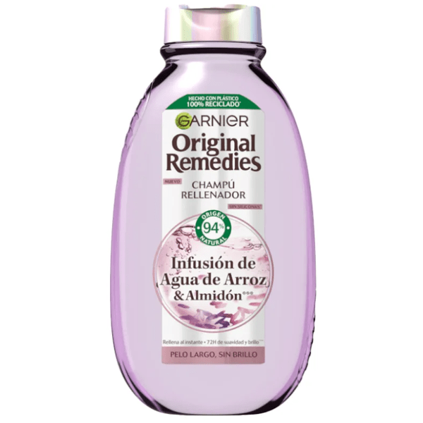 https://www.mifarma.eu/garnier-original-remedies-rice-water-shampoo-400-ml693698462395Garnier Original Remedies Rice Water Shampoo 400 ml<p><span style="font-weight: bold;">Garnier Original Remedies Rice Water Shampoo 400 ml</span></p><p> <span style="font-weight: bold;">Garnier Original Remedies Rice Water and Starch Infusion Filling Shampoo</span> is specifically designed to transform long, dull hair into <span style="font-weight: bold;">soft, radiant hair</span> .</p><p> Its unique formula combines <span style="font-weight: bold;">the moisturizing power of Rice Water,</span> known for its <span style="font-weight: bold;">nourishing</span> properties, and <span style="font-weight: bold;">Starch,</span> which helps <span style="font-weight: bold;">fill and soften the hair fiber</span> from the inside.</p><p> This infusion not only provides intensive treatment, but also seals in <span style="font-weight: bold;">moisture</span> , ensuring that hair maintains its <span style="font-weight: bold;">freshness and vitality</span> for a long time.</p><p> The shampoo's action <span style="font-weight: bold;">smooths the hair's surface,</span> resulting in an intense shine that captures light, making hair look healthy and vibrant.</p><p> The results are evident: <span style="font-weight: bold;">up to 72 hours of softness and a radiant shine</span> that lasts, as demonstrated in instrumental tests after applying the shampoo and mask from the same line.</p><p> This product is especially recommended for those looking to revitalize their long, lifeless hair, offering a hair care experience that is both visual and tactile.</p>https://assets.atida.com/transform/8ec30802-f2f3-4e78-8851-f4bc02b6f7f6/Garnier-Original-Remedies-Champu-Agua-Arroz-400-ml?io=transform:extend,width:250,height:2503.49instock3.992.8842965206612130.5Garnierhttps://www.mifarma.eu/media/catalog/product/f/f/f/7/fff7b17b0be49efcf8c19edc44b3fe2d10f32e08_Garnier_Original_Remedies_Champu_Agua_Arroz_400_ml.png/Health and Hygiene/Hair Care/Hair Shampoo/Health and Hygiene/Health and Hygiene/Hair Care/3x2 on Garnier, LOréal Paris, Maybelline & Mixa2025-10-02T00:08:29+0000