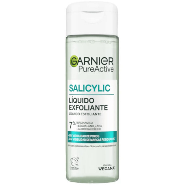https://www.mifarma.eu/garnier-pure-active-salicylic-exfoliating-liquid-120-ml 269361883939 Garnier Pure Active Salicylic Exfoliating Liquid 120 ml <p><span style="font-weight: bold;">Garnier Pure Active Salicylic Exfoliating Liquid 120 ml</span></p><p> <span style="font-weight: bold;">Garnier Salicylic Exfoliating Fluid, with 7% active ingredients such as niacinamide, squalane, AHA and salicylic acid</span> , is designed <span style="font-weight: bold;">to combat residual acne marks and improve skin texture</span> .</p><p> This <span style="font-weight: bold;">gentle, lightweight formula</span> not only reduces the appearance of pores, but also protects the skin barrier, which is essential for maintaining skin health.</p><p> Plus, <span style="font-weight: bold;">it's proven to provide up to 24 hours of hydration</span> , helping to keep skin fresh and radiant. The results of its effectiveness are remarkable*</p><p> Garnier is committed to more sustainable beauty by offering a <span style="font-weight: bold;">vegan and cruelty-free formula,</span> ensuring that no ingredients of animal origin are used. Additionally, the <span style="font-weight: bold;">bottle and cap are made from 100% recycled plastic</span> , thus contributing to the reduction of plastic waste.</p><p> This product represents an effective and responsible option for those looking to improve the appearance of their skin and protect the environment.</p> https://assets.atida.com/transform/aab4de8f-b361-4437-abb5-db9c714c3a45/Garnier-Pure-Active-Liquido-Exfoliante-Salicylic-120-ml?io=transform:extend,width:250,height:250 9.99 instock 10.95 8.2561973471074 9 0.96 Garnier https://www.mifarma.eu/media/catalog/product/d/8/f/3/d8f346c69e2dfac0c54aeac59080b28cad61484e_Garnier_Pure_Active_Liquido_Exfoliante_Salicylic_120_ml.png /Cosmetics and Beauty /Cosmetics and Beauty/Facial /Cosmetics and Beauty/Facial/Acne /Cosmetics and Beauty/Facial/Exfoliants /3x2 on Garnier, LOréal Paris, Maybelline & Mixa 2025-10-01T13:57:21+0000