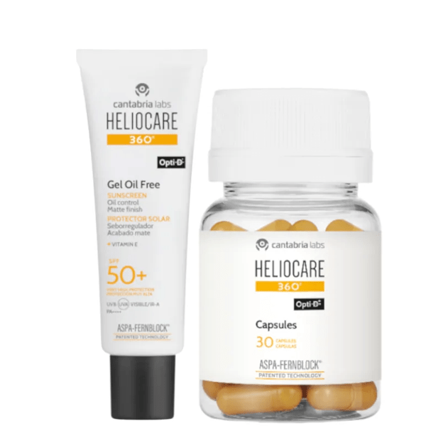https://www.mifarma.eu/heliocare-360-gel-oil-free-spf50-50-ml-heliocare-360-30-capsules534099484520Heliocare 360 Gel Oil Free SPF50 50 ml + Heliocare 360 30 Capsules<p><span>Heliocare 360 Gel Oil Free SPF50 50 ml + Heliocare 360 30 Capsules</span></p><p> Heliocare sun protection.</p><p> <span>Heliocare 360 Gel Oil Free SPF50 50 ml</span></p><p> This oil-free gel from Heliocare is designed with an extra melting texture that is easy to apply.</p><p> Prevents and delays cellular photoaging.</p><p> With UVA/UVB filters. With sun protection factor SPF 50.</p><p> Sebum-regulating and mattifying activity, it has a slight color.</p><p></p><p> With antioxidant action.</p><p> <strong>Waterproof</strong> .</p><p> <strong>Oil-free</strong> texture, especially suitable for <strong>combination and oily skin</strong> .</p><p> <span>Heliocare 360 30 Capsules</span></p><p> It acts as a <span>body photoprotector</span> and is especially indicated to act from inside the body.</p><p> Formulated with <strong>antioxidant active ingredients (</strong> Fernblock, cysteine, vitamins and prebiotic) <span> </span> that act on sun damage by repairing and protecting cells from the inside.</p><p> With photoprotective, anti-aging and antioxidant properties.</p><p> <span>Increases and prolongs the tan.</span></p><p> With UVA/UVB filters.</p><p> Does not contain gluten.</p><p> Suitable for <strong>all skin types</strong> .</p>https://assets.atida.com/transform/6d0cff12-3ae6-45ca-9dc2-9e611820970b/Heliocare-360-Gel-Oil-Free-SPF50-50-ml-Heliocare-360-30-Capsulas?io=transform:extend,width:250,height:25042.99instock62.6335.5289246198353119.64Cantabria Labshttps://www.mifarma.eu/media/catalog/product/c/c/0/f/cc0f141e9f499d26d9138b4ed18611b6a8c34b2e_Heliocare_360_Gel_Oil_Free_SPF50_50_ml_Heliocare_360_30_Capsulas.png/Mini Prices/Savings Packs/Health and Hygiene/Health and Hygiene/Sun Protection and Cream/Campaign Shop-in-Shop Pages/Health and Hygiene/Sun Protection and Cream/Facial Sun Protection/Health and Hygiene/Sun Protection and Cream/Oral Capsules/Savings Packs/Cosmetics and Beauty Packs/Campaign Shop-in-Shop Pages/Up to 70% off/Mifarma Days! Up to 70% off/Campaign Shop-in-Shop Pages/Mifarma Days NO/€5 off Heliocare Bundles2024-09-16T06:02:00+0000