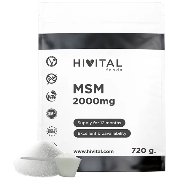 https://www.mifarma.eu/hivital-msm-2000mg-720-gr326420217337Hivital MSM 2000mg 720 gr<p><span style="font-weight: bold;">Hivital MSM 2000mg 720 gr</span></p><p> <span style="font-weight: bold;">MSM</span> (Methylsulfonylmethane) is an organic compound found in various natural sources and has gained popularity in the health and wellness field.</p><p> This product features a <span style="font-weight: bold;">100% vegan formula</span> , offering highly bioavailable organic sulfur, making it an essential ally for maintaining health.</p><p> <span style="font-weight: bold;">MSM</span> has been shown to be beneficial for <span style="font-weight: bold;">joint health,</span> helping to <span style="font-weight: bold;">reduce discomfort associated with joint wear and tear,</span> as well as <span style="font-weight: bold;">improving flexibility and mobility.</span></p><p> In addition, it has been observed that its regular consumption can contribute to <span style="font-weight: bold;">better skin, hair and nail health,</span> promoting a healthier and more radiant appearance.</p><p> <span style="font-weight: bold;">Each dose provides 2000 mg of MSM,</span> which has been purified through a chemical synthesis process that mimics the natural sulfur molecule, thus ensuring optimal absorption by the body.</p><p> Furthermore, this product <span style="font-weight: bold;">is distinguished by its purity</span> , as it is <span style="font-weight: bold;">free of magnesium stearate, dioxides, and other chemical additives</span> that are common in many supplements.</p><p> It is <span style="font-weight: bold;">100% vegan, gluten-free, lactose-free, soy-free, sugar-free, preservative-free, colorant-free, and also non-GMO</span> .</p><p> Manufacturing takes place in Spain, complying with the most demanding quality standards, such as GMP and ISO certifications. Hivital Foods is registered with AESAN, guaranteeing the safety and reliability of the product offered.</p>https://assets.atida.com/transform/3aed9557-dc2e-497e-a925-6a3485cd36a0/Hivital-MSM-2000mg-720-gr?io=transform:extend,width:250,height:25019.99instock2118.17272627272751.01Hivitalhttps://www.mifarma.eu/media/catalog/product/b/d/2/a/bd2a77b3df055895d16ef023b2f3526a4ad508a3_Hivital_MSM_2000mg_720_gr.png/Vitamins and Supplements/Supplements/Bones, Joints, and Muscles/Vitamins and Supplements/Supplements/Nails and skin/Vitamins and Supplements/Vitamins and Supplements/Supplements/Nutricosmetics2026-02-21T00:52:41+0000
