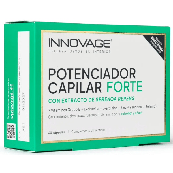 https://www.mifarma.eu/innovage-forte-hair-enhancer-60-capsules472457361773Innovage Forte Hair Enhancer 60 Capsules<p><span style="font-weight: bold;">Innovage Forte Hair Enhancer 60 Capsules</span></p><p> <span style="font-weight: bold;">Innovage Hair Enhancer Forte</span> is a food supplement formulated to <span style="font-weight: bold;">strengthen and revitalize hair</span> , becoming an essential ally in the fight <span style="font-weight: bold;">against hair loss.</span></p><p> This product combines a potent <span style="font-weight: bold;">Serenoa extract</span> , known for its beneficial properties for <span style="font-weight: bold;">hair health,</span> with a rich blend of <span style="font-weight: bold;">7 B vitamins, zinc, biotin, and selenium.</span></p><p> These substances work synergistically to provide the <span style="font-weight: bold;">necessary nutrients that promote hair growth and health</span> .</p><p> <span style="font-weight: bold;">- Serenoa extract</span> is particularly valued for its ability to <span style="font-weight: bold;">improve hair density and combat hair loss</span> , a problem that affects many people due to factors such as stress, hormonal or seasonal changes.</p><p> <span style="font-weight: bold;">Biotin,</span> for its part, is known as the hair vitamin, as it contributes to its <span style="font-weight: bold;">strength and shine.</span></p><p> <span style="font-weight: bold;">Zinc and selenium</span> are essential minerals that help <span style="font-weight: bold;">maintain a healthy scalp,</span> which is fundamental for optimal hair growth.</p><p> This product not only <span style="font-weight: bold;">improves the appearance of the hair</span> , making it look more voluminous and shiny, but also <span style="font-weight: bold;">works from the inside out, strengthening its structure and resistance to external aggressions</span> .</p>https://assets.atida.com/transform/90c7cd49-a670-4d8e-9d72-dc4db09b7e09/Innovage-Potenciador-Capilar-Forte-60-Capsulas?io=transform:extend,width:250,height:25034.99instock39.9931.809089909091135Innovagehttps://www.mifarma.eu/media/catalog/product/4/5/d/9/45d9efebd76d10e2a6fc1e8fcb9879df18287d9e_Innovage_Potenciador_Capilar_Forte_60_Capsulas.png/Health and Hygiene/Hair Care/Anti-Hair Loss/Health and Hygiene/Hair Care/Treatment/Health and Hygiene/Health and Hygiene/Hair Care/Vitamins and Supplements/Vitamins and Supplements/Minerals/Vitamins and Supplements/Supplements/Vitamins and Supplements/Vitamins (A-K)2026-03-18T01:05:20+0000