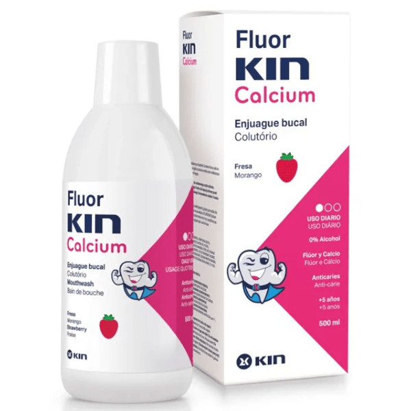 https://www.mifarma.eu/kin-fluorkin-rinse-oral-calcium-taste-strawberry-500ml933490289067Kin FluorKin Calcium Mouthwash Strawberry Flavor 500 ml<p><span style="font-weight: 700;">Kin FluorKin Calcium Mouthwash Strawberry Flavor 500 ml</span></p><p> Oral hygiene for little ones is crucial from the moment their first teeth erupt. Kin <span style="font-weight: bold;">FluorKin Calcium Strawberry Mouthwash</span> has been <span style="font-weight: bold;">specifically formulated to enhance dental protection in children</span> , helping to prevent cavities safely and effectively.</p><p> <span style="font-weight: bold;">Enriched with calcium and phosphorus</span> , essential minerals for dental development, and fluoride, this mouthwash <span style="font-weight: bold;">strengthens enamel and fights dental biofilm</span> . Daily use, as a complement to brushing, provides <span style="font-weight: bold;">additional protection in hard-to-reach areas, essential in children's hygiene routines</span> .</p><p> <span style="font-weight: bold;">Highlighted Benefits:</span></p><p> - <span style="font-weight: bold;">Prevents tooth decay</span> , even from the first teeth.</p><p> - <span style="font-weight: bold;">With calcium and phosphorus</span> , which contribute to the formation and strengthening of enamel.</p><p> - <span style="font-weight: bold;">With 224 ppm F fluoride</span> , for a protective action against plaque acids.</p><p> - <span style="font-weight: bold;">Helps control dental biofilm</span> , improving hygiene in areas where the toothbrush cannot reach.</p><p> - <span style="font-weight: bold;">Soft and pleasant strawberry flavor</span> , ideal for encouraging daily use in children.</p><p> FluorKin Calcium Mouthwash is the perfect complement to a complete and safe oral hygiene routine in childhood, helping to take care of every smile from the beginning.</p>https://assets.atida.com/transform/8f7dde54-0eda-44ce-a728-046ee869d11f/Kin-Fluorkin-Enjuague-Bucal-Calcium-Sabor-Fresa-500-ml?io=transform:extend,width:250,height:2508.99instock10.237.4297510661157121.24Kinhttps://www.mifarma.eu/media/catalog/product/7/0/1/7/70175c934c6e1b716eb703aef9e0fae66982cadd_Product_Tile_Thumbnail_Kin_Fluorkin_Enjuague_Bucal_Calcium_Sabor_Fresa_500_ml.png/Children Dental Care/Mouthwash for Children/Children Dental Care2024-09-16T06:24:19+0000
