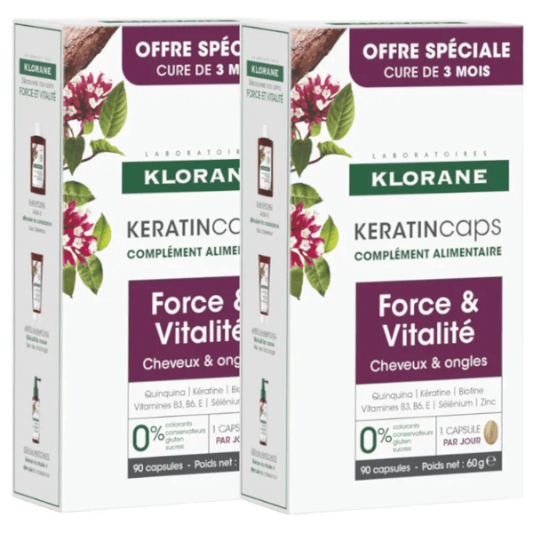 https://www.mifarma.eu/klorane-keratincaps-hair-nails-6x30-capsules626169095342Klorane KeratinCaps Hair Nails 6x30 Capsules<p><span style="font-weight: bold;">Klorane KeratinCaps Hair Nails 6x30 Capsules</span></p><p> <strong>KeratinCaps</strong> is a fortifying treatment that keeps hair and nails in good condition.</p><p> Its optimal formula nourishes the hair bulb with nutrients to provide strength and vitality to the hair.</p><p> Contains <strong>keratin</strong> , the protein that makes up hair; <strong>vitamin B6</strong> , which contributes to the normal synthesis of cysteine and sulfur amino acids; <strong>vitamin B8 (biotin),</strong> zinc <strong> </strong> and <strong> </strong> Selenium <strong>for completely healthy hair.</strong></p><p> <strong>Vitamin E</strong> contributes to the protection of cells against oxidative damage, and <strong>vitamin B3</strong> helps reduce fatigue.</p><p> With dry extract of quinine.</p><p> Suitable for <span style="font-weight: bold;">pregnant women from the second trimester</span> and during breastfeeding.</p>https://assets.atida.com/transform/79539a1a-db01-4c8f-b1aa-c702a8a77073/Klorane-KeratinCaps-Cabello-Unas-6x30-Capsulas?io=transform:extend,width:250,height:25054.99instock119.849.9909080909095464.81Kloranehttps://www.mifarma.eu/media/catalog/product/c/e/1/7/ce17ea9cd1b091fc36bf1c2a6ede601cfa22ea24_Klorane_KeratinCaps_Cabello_Unas_6x30_Capsulas.png/Health and Hygiene/Hair Care/Anti-Hair Loss/Mini Prices/Savings Packs/Health and Hygiene Packs/Savings Packs/Health and Hygiene/Health and Hygiene/Hair Care2025-08-04T23:47:05+0000