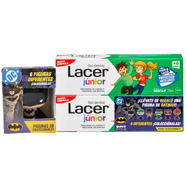 https://www.mifarma.eu/lacer-junior-mint-gel-6-years-2x75-ml-justice-league-figure314747558552Lacer Junior Mint Gel +6 Years 2x75 ml + Batman Figure<p><span style="font-weight: 700;">Lacer Junior Mint Gel +6 Years 2x75 ml + Batman Figure</span></p><p> This product is specially designed for <span style="font-weight: bold;">children over 6</span> years old, and helps with oral care and the prevention of dental problems.</p><p> It consists of a <span style="font-weight: bold;">fluoride</span> toothpaste that helps remineralize tooth enamel and prevent cavities.</p><p> In addition, its pleasant mint flavor provides a refreshing sensation in the mouth.</p><p> As an added bonus, the product includes a Batman figure that makes brushing more fun and engaging for children. Taking care of your little ones' dental health has never been so easy and fun!</p><p> <span style="font-weight: bold;">The figure is sent randomly.</span></p>https://assets.atida.com/transform/fd2d6049-f52e-44e2-9d98-0e6c37413410/Lacer-Junior-Menta-Gel-6-Anos-2x75-ml-Figura-de-Batman?io=transform:extend,width:250,height:2508.99instock9.997.4297510661157101Lacerhttps://www.mifarma.eu/media/catalog/product/1/e/b/3/1eb33457f7a7829573b4aa255ab338a58c0fd00c_Lacer_Junior_Menta_Gel_6_Anos_2x75_ml_Figura_de_Batman.png/Health and Hygiene/Health and Hygiene/Children Dental Care/Health and Hygiene/Children Dental Care/Toothpaste for Children2024-10-10T23:47:01+0000