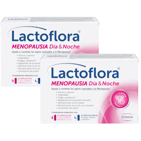 https://www.mifarma.eu/lactoflora-menopause-day-and-night-2x60-capsules753884447671Lactoflora Menopause Day and Night 2x60 Capsules<p><span style="font-weight: bold;">Lactoflora Menopause Day and Night 2x60 Capsules</span></p><p> <span style="font-weight: 700;">Lactoflora Menopause Day and Night</span> is a formula designed to accompany women in every stage of this natural process, <span style="font-weight: bold;">offering comfort and well-being</span> not only physical, but also emotional.</p><p> <span style="font-weight: bold;">During the day</span> , the <span style="font-weight: bold;">pink capsules</span> unleash their power with a unique blend of <span style="font-weight: bold;">live probiotics and vitamins B6, B7, and D,</span> designed to <span style="font-weight: bold;">restore the balance of the gut microbiota,</span> crucial for maintaining <span style="font-weight: bold;">healthy hormone levels</span> . This synergistic combination works tirelessly to <span style="font-weight: bold;">reduce fatigue, keeping your skin, mucous membranes, and bones in top condition.</span></p><p> <span style="font-weight: bold;">- At night,</span> the <span style="font-weight: bold;">blue capsule</span> becomes your best ally. Formulated with <span style="font-weight: bold;">black cohosh, magnesium</span> , and an appropriate dose of <span style="font-weight: bold;">melatonin</span> , this trio is designed to <span style="font-weight: bold;">alleviate night sweats, relax your muscles, and lull you into a deep and restorative sleep</span> , allowing you to wake up completely refreshed.</p><p> This supplement is specifically designed for <span style="font-weight: bold;">women going through perimenopause or menopause,</span> seeking a natural and effective solution that safely improves their quality of life.</p>https://assets.atida.com/transform/bf5a9138-95ee-4936-906c-221d667da026/Lactoflora-Menopausia-Dia-y-Noche-2x60-Capsulas?io=transform:extend,width:250,height:25043.99instock51.939.990908090909157.91Lactoflorahttps://www.mifarma.eu/media/catalog/product/9/c/7/d/9c7d6affaafcbc2b6b9d5acab0ceb9396a58dbde_Lactoflora_Menopausia_Dia_y_Noche_2x60_Capsulas.png/Vitamins and Supplements/Supplements/Bones, Joints, and Muscles/Vitamins and Supplements/Supplements/Digestive System/Health and Hygiene/Health and Hygiene/Women’s Health/Vitamins and Supplements/Supplements/Sleep/Vitamins and Supplements/Vitamins and Supplements/Minerals/Vitamins and Supplements/Probiotics/Vitamins and Supplements/Supplements/Vitamins and Supplements/Vitamins (A-K)/Health and Hygiene/Women’s Health/Menopause/15% off Lactoflora2025-11-22T01:13:00+0000