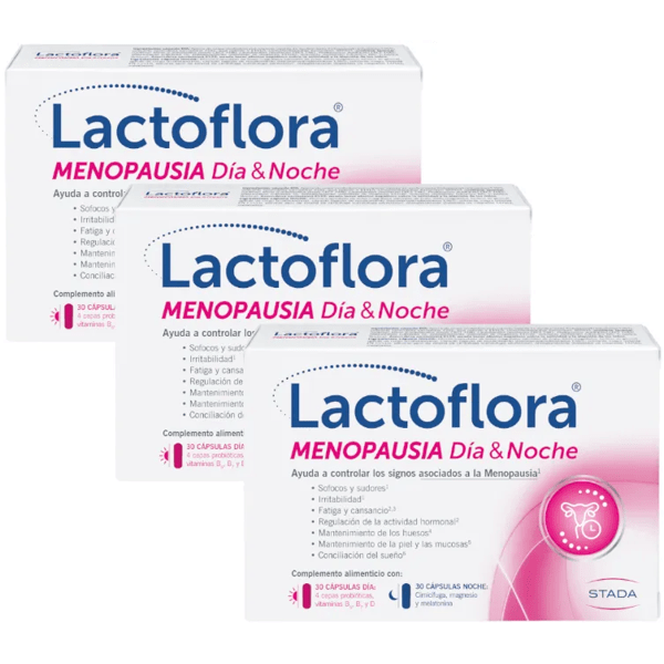 https://www.mifarma.eu/lactoflora-menopause-day-and-night-3x60-capsules852845871044Lactoflora Menopause Day and Night 3x60 Capsules<p><span style="font-weight: bold;">Lactoflora Menopause Day and Night 3x60 Capsules</span></p><p> <span style="font-weight: 700;">Lactoflora Menopause Day and Night</span> is a formula designed to accompany women in every stage of this natural process, <span style="font-weight: bold;">offering comfort and well-being</span> not only physical, but also emotional.</p><p> <span style="font-weight: bold;">During the day</span> , the <span style="font-weight: bold;">pink capsules</span> unleash their power with a unique blend of <span style="font-weight: bold;">live probiotics and vitamins B6, B7, and D,</span> designed to <span style="font-weight: bold;">restore the balance of the gut microbiota,</span> crucial for maintaining <span style="font-weight: bold;">healthy hormone levels</span> . This synergistic combination works tirelessly to <span style="font-weight: bold;">reduce fatigue, keeping your skin, mucous membranes, and bones in top condition.</span></p><p> <span style="font-weight: bold;">- At night,</span> the <span style="font-weight: bold;">blue capsule</span> becomes your best ally. Formulated with <span style="font-weight: bold;">black cohosh, magnesium</span> , and an appropriate dose of <span style="font-weight: bold;">melatonin</span> , this trio is designed to <span style="font-weight: bold;">alleviate night sweats, relax your muscles, and lull you into a deep and restorative sleep</span> , allowing you to wake up completely refreshed.</p><p> This supplement is specifically designed for <span style="font-weight: bold;">women going through perimenopause or menopause,</span> seeking a natural and effective solution that safely improves their quality of life.</p>https://assets.atida.com/transform/66561758-f1dc-42de-8106-313c7527b1ac/Lactoflora-Menopausia-Dia-y-Noche-3x60-Capsulas?io=transform:extend,width:250,height:25059.99instock77.8554.5363626363642317.86Lactoflorahttps://www.mifarma.eu/media/catalog/product/2/5/3/1/253189fc906d95e1011c34c5ab977de753ad9987_Lactoflora_Menopausia_Dia_y_Noche_3x60_Capsulas.png/Vitamins and Supplements/Supplements/Bones, Joints, and Muscles/Vitamins and Supplements/Supplements/Digestive System/Savings Packs/Vitamins and Supplements Packs/Savings Packs/Health and Hygiene/Health and Hygiene/Women’s Health/Vitamins and Supplements/Supplements/Sleep/Vitamins and Supplements/Vitamins and Supplements/Minerals/Vitamins and Supplements/Probiotics/Vitamins and Supplements/Supplements/Vitamins and Supplements/Vitamins (A-K)/Health and Hygiene/Women’s Health/Menopause2025-11-18T01:22:21+0000