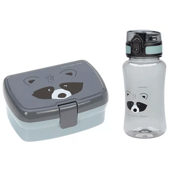 Lunch set consisting of a lunch box and a 460 ml bottle in gray with a funny raccoon print.