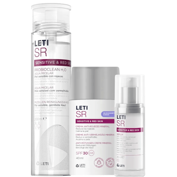 - Leti SR Serum 30 ml: Aqua (Water), Glycerin (Glycerol), Plukenetia volubilis (Sacha Inchi) seed oil, Ribes nigrum (Black Currant) oil, Butylene glycol, Dimethicone, Helianthus annuus (Sunflower) Seed Oil Unsaponifiables, Niacinamide, Panthenol, Polymethylsilsesquioxane, Polyacrylate crosspolymer-6, Octyldodecanol, Butyrospermum parkii (Shea) Butter Extract, Propanediol, Sodium Dextran Sulfate, Sodium Methylesculetin Acetate, Octyldodecyl Acetate, Tocopherol, Ascorbyl Tetraisopalmitate, Hydrolyzed Algin, Pisum sativum (Pea) Extract, Biosaccharide Gum-2, Acetyl Tetrapeptide-15, Palmitoyl Tripeptide-5, Palmitoyl Tetrapeptide-7, Palmitoyl Oligopeptide, Caprylic/Capric Triglyceride, Citric Acid, Sodium Citrate, Cetyl Hydroxyethylcellulose, Mannitol, Trisodium Ethylenediamine Disuccinate, Cyclodextrin, Ethylhexylglycerin, Diethylhexyl Syringylidenemalonate, p-Anisic Acid, Parfum (Fragrance), Sodium Hydroxide. - Leti SR ProbioClean H2O Micellar Water 200 ml: Aqua (Water), Butylene Glycol, PEG-6 Caprylic/Capric Glycerides, Lactobacillus Ferment, PEG-40 Hydrogenated Castor Oil, Ethylhexylglycerin, Disodium EDTA. - Leti SR Mineral Anti-Redness Cream SPF30 40 ml: Aqua (Water), Propylene Glycol, Diheptanoate, Zinc Oxide (Nano), Propanediol, Butyloctyl Salicylate, Titanium Dioxide (Nano), Undecane, Magnesium Sulfate, Caprylic/Capric Triglyceride, Salicylate, Titanium Dioxide (Nano), Undecane, Magnesium Sulfate, Caprylic/Capric Triglyceride,Polyglyceryl-6 Polyricinoleate, Disteardimonium Hectorite, Polyglyceryl-2 Isostearate, Tridecane,Laminaria Ochroleuca Extract, Schisandra Sphenanthera, Fruit Extract, Taraxacum Officinale Rhizome/Root, Fruit Extract, Taraxacum Officinale Rhizome/Root, Extract, Pentylene Glycol, Piperonyl Glucoside, Tocopheryl Acetate, Glyceryl Caprylate, Glyceryl Undecylenate, Tocopherol, Xanthan Gum, Maltodextrin, Triethoxycaprylylsilane, Aluminum Hydroxide, Stearic Acid, Sodium Hydroxide.How to use