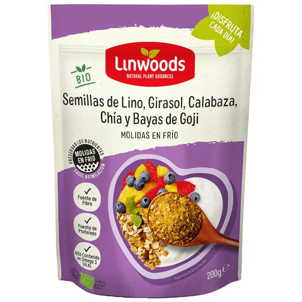 https://www.mifarma.eu/linwoods-organic-ground-flax-sunflower-pumpkin-chia-and-goji-berry-seeds-200g508546264366Linwoods Organic Ground Flax, Sunflower, Pumpkin, Chia and Goji Berry Seeds 200g<p><span style="font-weight: bold;">Linwoods Organic Ground Flax, Sunflower, Pumpkin, Chia and Goji Berry Seeds 200g</span></p><p> This product consists of a mixture of <span style="font-weight: bold;">flax, sunflower, pumpkin, chia (Salvia hispanica) seeds and Goji berries,</span> all <span style="font-weight: bold;">cold-ground and organically sourced.</span></p><p> These seeds are recognized for their exceptional nutritional profile, providing <span style="font-weight: bold;">a rich source of essential omega-3 and omega-6 fatty acids</span> , which are fundamental to maintaining <span style="font-weight: bold;">good cardiovascular and brain health.</span></p><p> <span style="font-weight: bold;">Chia seeds</span> , in particular, are known for their <span style="font-weight: bold;">ability to absorb water,</span> forming a gel that can help <span style="font-weight: bold;">prolong the feeling of fullness,</span> making them an ideal ally in weight-control diets. Furthermore, their <span style="font-weight: bold;">high fiber content</span> contributes to <span style="font-weight: bold;">healthy digestion and intestinal well-being</span> .</p><p> <span style="font-weight: bold;">The goji berries</span> included in this blend are valued for their <span style="font-weight: bold;">high antioxidant content</span> , which helps <span style="font-weight: bold;">combat oxidative stress in the body.</span> These <span style="font-weight: bold;">antioxidants</span> are essential for maintaining a <span style="font-weight: bold;">strong immune system and contributing to overall well-being.</span></p>https://assets.atida.com/transform/bf8c0707-1fa7-497d-b69b-397aacb953de/Linwoods-Semillas-Lino-Girasol-Calabaza-Chia-y-Bayas-de-Goji-Molidas-Bio-200-gr?io=transform:extend,width:250,height:2504.99outofstock6.474.5363626363636231.48Linwoodshttps://www.mifarma.eu/media/catalog/product/5/7/3/6/5736ccf27ef9846b3159d432884cc29225a14890_Linwoods_Semillas_Lino_Girasol_Calabaza_Chia_y_Bayas_de_Goji_Molidas_Bio_200_gr.png/Nutrition/Nutrition/Feeding/Nutrition/Feeding/Seeds and Superfoods2026-04-17T00:03:56+0000