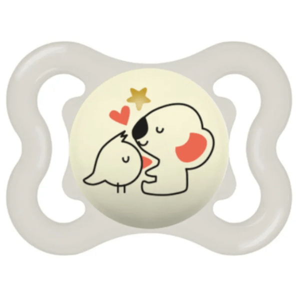 Pacifier with silicone nipple for babies between 2-6 months , specially designed to prevent poor alignment of the teeth.