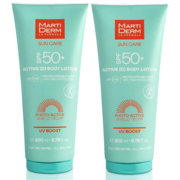 https://www.mifarma.eu/martiderm-actived-body-lotion-sun-cream-spf50-2x200-ml 323782055139 MartiDerm ActiveD Body Lotion Sun Cream SPF50+ 2x200 ml <p><span style="font-weight: bold;">MartiDerm ActiveD Body Lotion SPF50+ 2x200 ml<br></span></p><p> Body sun protection SPF 50+, with a light lotion texture that is easily absorbed.</p><p> Suitable for the whole family, adults and children from 3 years old.</p><p> Increases SPF when exposed to UV radiation, thanks to the exclusive Photo-Active Shield Tech®.</p><p> It causes the filters and other ingredients to activate with UV radiation, instead of remaining stable or degrading like most conventional filters.</p><p> In addition, its formula is enriched with moisturizing and repairing active ingredients.</p><p> Water resistant.</p><p> Sea Friendly formula, more sustainable for seas and oceans.</p> https://assets.atida.com/transform/f24d4340-e61e-496b-acd3-7a08bbee37a1/MartiDerm-ActiveD-Body-Lotion-Crema-Solar-SPF50-2x200-ml?io=transform:extend,width:250,height:250 39.99 instock 59.98 33.04958577686 33 19.99 Martiderm https://www.mifarma.eu/media/catalog/product/0/b/d/6/0bd6c86811a17273771b6bca442c8dfc9ce8c92b_MartiDerm_ActiveD_Body_Lotion_Crema_Solar_SPF50_2x200_ml.png /Savings Packs/Health and Hygiene Packs /Savings Packs /Health and Hygiene /Health and Hygiene/Sun Protection and Cream /Health and Hygiene/Sun Protection and Cream/Body Sun Protection /Mini Prices /50% off 2nd unit Martiderm 2026-03-03T00:53:00+0000