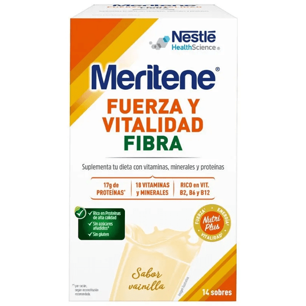 https://www.mifarma.eu/meritene-fiber-powder-vanilla-14-envelopes907237948427Meritene Strength and Vitality Vanilla Fiber 14 Sachets<p><strong>Meritene Strength and Vitality Vanilla Fiber 14 Sachets</strong></p><p> A shake rich in vitamins, minerals and proteins that helps supplement your diet and combat the feeling of weakness and fatigue, giving you extra strength and vitality.</p><p> Its <strong>high fiber content</strong> can help regulate intestinal transit.</p><p> Formulated with <strong>19 vitamins and minerals:</strong></p><p> - Calcium and Vitamin D contribute to the maintenance of bones.</p><p> - Vitamin B2, B6, B12, Magnesium and Iron help reduce tiredness and fatigue.</p><p> - Vitamin C and Zinc contribute to the normal function of the immune system.</p><p> It also contains high-quality proteins that contribute to the development and maintenance of muscle mass.</p><p> It is indicated for the same cases as Meritene Powder but also helps to reach the recommended levels of fiber by promoting the regulation of intestinal transit, improves the balance of bacterial flora and benefits diabetic patients.</p><p> If you have no appetite, if you feel tired, if you are weak or convalescing, if you are pregnant, if you do sports activities or if your nutrition is unbalanced or insufficient.</p><p> It is low in fat and cholesterol free.</p><p> <strong>Suitable for diabetics, sucrose-free and gluten-free.</strong></p>https://assets.atida.com/transform/8d21d2ef-2a5c-4c6c-871f-692ec588cbb1/Meritene-Fuerza-y-Vitalidad-Fibra-Vainilla-14-Sobres?io=transform:extend,width:250,height:25019.99instock25.2618.172726272727215.27Meritenehttps://www.mifarma.eu/media/catalog/product/2/9/9/3/2993bc2f53c3f4390f977cc345c12a3bc017c303_Meritene_Fuerza_y_Vitalidad_Fibra_Vainilla_14_Sobres.png/Mini Prices/Vitamins and Supplements/Vitamins and Supplements/Multivitamins/Vitamins and Supplements/Supplements/cyber_monday_pt_int/Nutrition/Nutrition/Feeding/NO MIFARMA DAYS/Up to 70% off/Mifarma Days NO/Singles' Day: Up to 70% off!/15% off Selected Meritene2024-09-16T06:23:04+0000