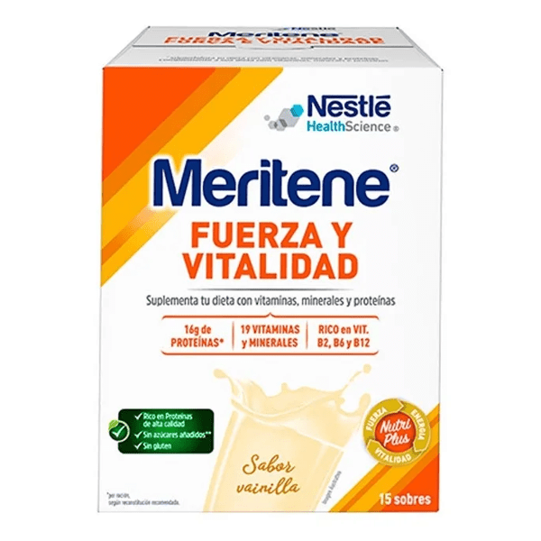 https://www.mifarma.eu/meritene-powder-15-vanilla-envelopes-30grams124127721217Meritene Strength and Vitality Vanilla 15x30 gr Sachets <p><span style="font-weight: 700;">Meritene Strength and Vitality Vanilla 15x30 gr Sachets</span></p><p> <span style="font-weight: 700;">Meritene Strength and Vitality Vanilla</span> is a <span style="font-weight: bold;">powdered shake</span> that offers benefits to <span style="font-weight: bold;">increase muscle mass and revitalize the body.</span></p><p> Contains <span style="font-weight: bold;">high-quality proteins</span> that contribute to the <span style="font-weight: bold;">development and maintenance of muscle mass.</span></p><p> In addition, with <span style="font-weight: bold;">magnesium, vitamin B2, B6 and B12</span> it helps <span style="font-weight: bold;">reduce tiredness and fatigue</span> .</p><p> This dietary supplement also contains <span style="font-weight: bold;">calcium, vitamin D, vitamin C, zinc and iron,</span> which contribute to <span style="font-weight: bold;">bone maintenance and immune function.</span></p><p> It is ideal for combating the feeling of lack of strength and activating the body.</p><p> It is low in fat and cholesterol free.</p><p> <span style="font-weight: bold;">Suitable for diabetics.</span></p><p> <span style="font-weight: bold;">Gluten and sucrose free.</span></p>https://assets.atida.com/transform/8d2624b9-98df-48ba-9fd4-36af57dcaedc/Meritene-Fuerza-y-Vitalidad-Vainilla-15x30-gr-Sobres?io=transform:extend,width:250,height:25018.99instock24.1117.263635363636215.12Meritenehttps://www.mifarma.eu/media/catalog/product/b/0/5/d/b05d828365852d4b42d2ab4e74f5018eb81a51ff_Meritene_Fuerza_y_Vitalidad_Vainilla_15x30_gr_Sobres.png/Nutrition/Nutrition/Feeding/cyber_monday_pt_int/NO MIFARMA DAYS/Up to 70% off/Vitamins and Supplements/Mifarma Days NO/Singles' Day: Up to 70% off!/15% off Selected Meritene2024-09-16T05:42:10+0000