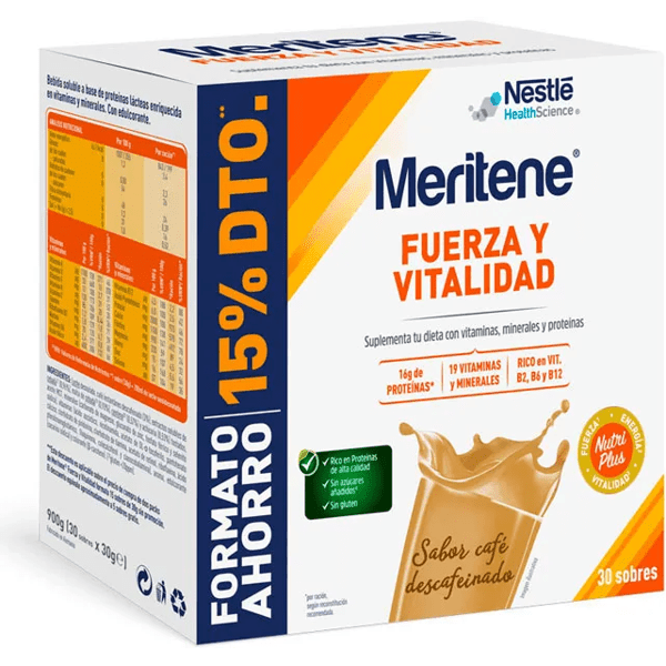 https://www.mifarma.eu/meritene-strength-and-vitality-decaffeinated-coffee-30-envelopes-x-30gr100364028087Meritene Strength and Vitality Decaffeinated Coffee 30 Sachets x 30 gr<p><span style="font-weight: bold;">Meritene Strength and Vitality Decaffeinated Coffee 30 Sachets x 30 gr</span></p><p> This food supplement has a <span style="font-weight: bold;">high content of proteins,</span> <span style="font-weight: bold;">energy, vitamins and minerals</span> that helps to complete your diet and that of your loved ones.</p><p> Rich in protein, calcium, vitamin D, vitamin C, vitamins B2, B6, B12, magnesium, iron and zinc.</p><p> Helps <span style="font-weight: bold;">strengthen the immune system and combat tiredness and fatigue.</span></p><p> It is low in fat and cholesterol free.</p><p> Recommended if you have no appetite, if you feel tired, if you are weak or convalescing, if you are pregnant, if you do sports activities, if your nutrition is unbalanced or insufficient.</p><p> <span style="font-weight: bold;">Gluten and sucrose free.</span></p><p> <span style="font-weight: bold;">Suitable for diabetics.</span><br></p>https://assets.atida.com/transform/aff4dfd6-350f-4ab2-92cd-e8e4fe121a54/Meritene-Fuerza-y-Vitalidad-Cafe-Descafeinado-30x30gr-Sobres?io=transform:extend,width:250,height:25035.99instock42.0932.718180818182146.1Meritenehttps://www.mifarma.eu/media/catalog/product/a/0/f/5/a0f5a02444f92e10a1af126db1864221e4a716b4_Meritene_Fuerza_y_Vitalidad_Cafe_Descafeinado_30x30gr_Sobres.png/Nutrition/Nutrition/Feeding/Vitamins and Supplements/Vitamins and Supplements/Supplements/cyber_monday_pt_int/Mini Prices/NO MIFARMA DAYS2024-09-16T05:41:04+0000
