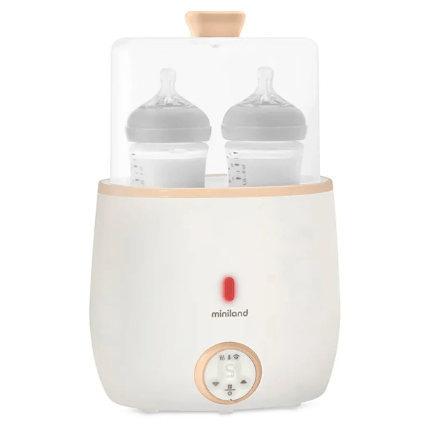 The Warmy Twin by Miniland is a multi-function bottle warmer and sterilizer , ideal for parents of twins . It allows you to warm up to two bottles or jars of baby food simultaneously , saving time and effort in your daily routine. It uses high-temperature steam , ensuring even and natural heating that preserves the nutrients and vitamins in breast milk and food.
