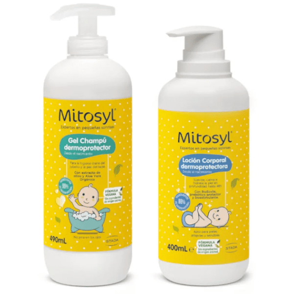 - Mitosyl Dermoprotective Shampoo Gel 490 ml: Apply the desired amount and lather in the palm of your hand, then use it to wash the baby's body and wet hair. Rinse thoroughly.