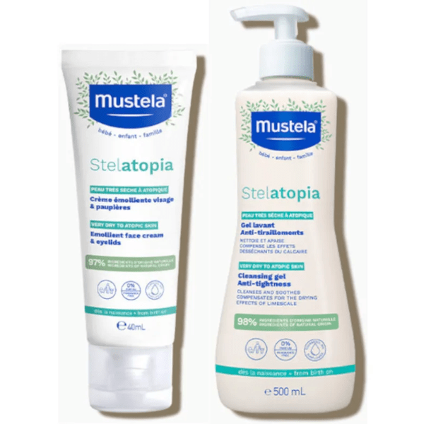 The Mustela Stelatopia Savings Pack includes the 40ml Facial Emollient Cream and the 500ml Bath Gel, both specially formulated for the care of the skin of babies and children with atopic or very dry skin.