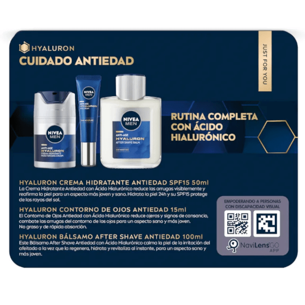 - Nivea Hyaluron Anti-Aging After Shave Balm 100 ml : acts as a perfect ally after shaving. This balm soothes irritated skin, while at the same time regenerating, hydrating, and refreshing, providing a healthy and youthful appearance. Using it after shaving not only prevents irritation but also helps keep the skin in optimal condition. The combination of these three products offers a comprehensive approach to men's facial care, ensuring visible results and a feeling of well-being. With NIVEA MEN Hyaluron, every day is an opportunity for younger, healthier-looking skin.