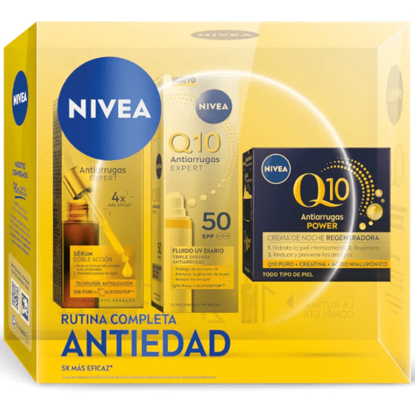 NIVEA Q10 Double Action Anti-Wrinkle Serum Expert 30ml: Aqua, Glycerin, Caprylic/Capric Triglyceride, Alcohol Denat., Cocoglycerides, Glyceryl Stearate Citrate, Butyrospermum Parkii Butter, Distarch Phosphate, Ubiquinone, 1-Methylhydantoin-2-Imide, Creatine, Hydroxyacetophenone, Xanthan Gum, Sodium Hydroxide, Phenoxyethanol, Pogostemon Cablin Oil, Parfum NIVEA Q10 Power Anti-Wrinkle and Firmness Night Cream 50ml: Aqua, Glycerin, Cetearyl Alcohol, Caprylic/Capric Triglyceride, Butyrospermum Parkii Butter, Cocoglycerides, Methylpropanediol, Hydrogenated Coco-Glycerides, Glyceryl Stearate Citrate, Cetearyl Isononanoate, Triisostearin, Squalane, Macadamia Integrifolia Seed Oil, Ubiquinone, Panthenol, Creatine, 1-Methylhydantoin-2-Imide, Pantolactone, Glyceryl Stearate, Xanthan Gum, Ethylhexylglycerin, Caprylyl Glycol, Sodium Hydroxide, Citric Acid, Phenoxyethanol, Parfum NIVEA Q10 Antiwrinkle Expert Daily UV Fluid SPF50 40ml: Aqua, Glycerin, Butyl Methoxydibenzoylmethane, Bis-Ethylhexyloxyphenol Methoxyphenyl Triazine, Isopropyl Palmitate, Alcohol Denat., C12-15 Alkyl Benzoate, Distarch Phosphate, Glyceryl Stearate, Dibutyl Adipate, Ethylhexyl Triazone, Butylene Glycol Dicaprylate/Dicaprate, Phenylbenzimidazole Sulfonic Acid, Tapioca Starch, Cetyl Alcohol, Stearyl Alcohol, Cocoglycerides, Diethylamino Hydroxybenzoyl Hexyl Benzoate, Ubiquinone, Creatine, 1-Methylhydantoin-2-Imide, Acetyl Hydroxyproline, Glycyrrhiza Inflata Root Extract, Sodium Stearoyl Glutamate, Caprylyl Glycol, Ethylhexylglycerin, Xanthan Gum, Trisodium EDTA, Sodium Hydroxide, Phenoxyethanol, ParfumHow to use