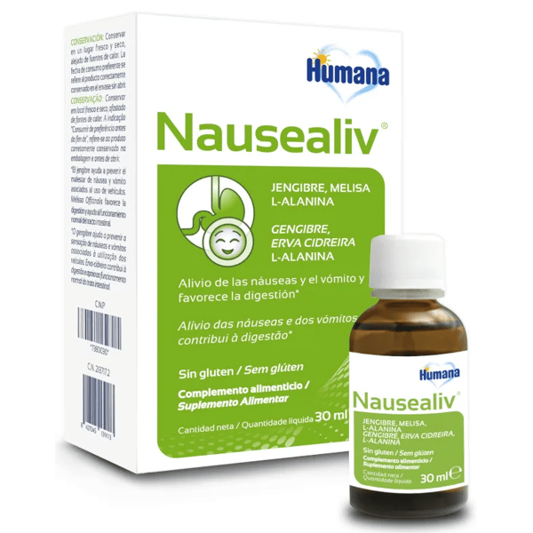 https://www.mifarma.eu/null-105506922867987Humana Baby Nausealiv Nausea, Dizziness and Vomiting Relief 30 ml<p><span style="font-weight: bold;">Humana Baby Nausealiv Nausea, Dizziness and Vomiting Relief 30 ml</span></p><p> <span style="font-weight: bold;">Humana Baby Nausealiv</span> is a food supplement with a unique formula, based on <span style="font-weight: bold;">ginger, lemon balm, L-Alanine and B complex vitamins (B1, B2 and B6).</span></p><p> It consists of a natural alternative that <span style="font-weight: bold;">provides relief and prevention of nausea, dizziness and vomiting in children.</span></p><p> In addition, it aids in <span style="font-weight: bold;">proper digestion.</span></p><p> <span style="font-weight: bold;">It does not contain gluten.</span></p><p> Discover an effective and safe way to care for little ones in situations of stomach upset.</p><p> All Humana products are made from carefully selected and controlled raw materials of the highest quality and purity. Based on over 70 years of experience in infant nutrition, our product range includes vitamins, minerals, herbal extracts, and other substances specially chosen to meet your individual needs and those of your little ones.</p><p> Developed by scientists, always according to the latest discoveries of science and nature.</p><p> To ensure quality, we conduct continuous and thorough checks before, during, and after the manufacturing process. Quality certified according to DIN ISO 9001 standards since 1995.</p>https://assets.atida.com/transform/f395e978-d9af-488a-941c-96ac428b4849/Humana-Baby-Nausealiv-Alivio-de-Nauseas-Mareos-y-Vomito-30-ml?io=transform:extend,width:250,height:2508.99outofstock8.998.172726272727300Humanahttps://www.mifarma.eu/media/catalog/product/f/2/9/3/f29306fa967660fc8807e01b25e188e757168c5f_Humana_Baby_Nausealiv_Alivio_de_Nauseas_Mareos_y_Vomito_30_ml.png/Baby and Mom/Vitamins and Supplements/Baby and Mom/Children's health2024-09-16T06:00:31+0000