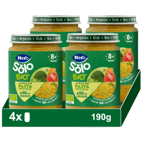 https://www.mifarma.eu/null-166737972082184Hero Solo Jar Vegetables with Whole Wheat Pasta ECO +8m 4x190 gr<p><span style="font-weight: bold;">Hero Solo Jar Vegetables with Whole Wheat Pasta ECO +8m 4x190 gr</span></p><p> <span style="font-weight: bold;">Savings pack of 4 jars of Hero Solo vegetables with wholemeal pasta</span> made with organic ingredients, designed for babies <span style="font-weight: bold;">from 8 months</span> .</p><p> Contains a combination of vegetables and whole grain pasta that provides <span style="font-weight: bold;">carbohydrates and fiber</span> , promoting a healthy digestive system.</p><p> This product <span style="font-weight: bold;">contains no added sugars</span> , offering a nutritious and healthy option for babies.</p><p> In addition, the jar of vegetables with wholemeal pasta provides a complete and balanced diet for the little ones, facilitating the introduction of flavours and textures into their diet.</p><p> Hero Solo promotes healthy, natural nutrition for baby development.</p>https://assets.atida.com/transform/fa19f176-e22c-4b72-8d0a-8f54e9b26be0/Hero-Solo-Bio-Tarrito-Verduras-con-Pasta-Integral-ECO-8m-4x190-gr?io=transform:extend,width:250,height:2508.99outofstock11.968.1727262727273252.97Hero Solohttps://www.mifarma.eu/media/catalog/product/e/d/a/7/eda7dd0a03aa66484b517630a48945d78f20b6fe_Hero_Solo_Bio_Tarrito_Verduras_con_Pasta_Integral_ECO_8m_4x190_gr.png/Baby and Mom/Feeding/Baby Food and Jars/Baby and Mom/Baby and Mom/Feeding/Mini Prices/Savings Packs/Savings Packs/Baby and Mum Packs/cyber_monday_pt_int/Atida Cash 5%2024-09-16T06:13:46+0000