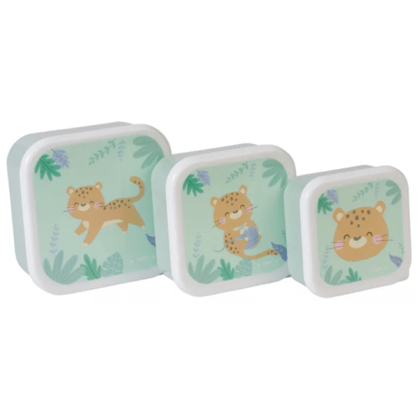 Innovative set of 3 boxes of different sizes in green and with a tiger print , allows children to carry their favorite foods and snacks in a practical and safe way.