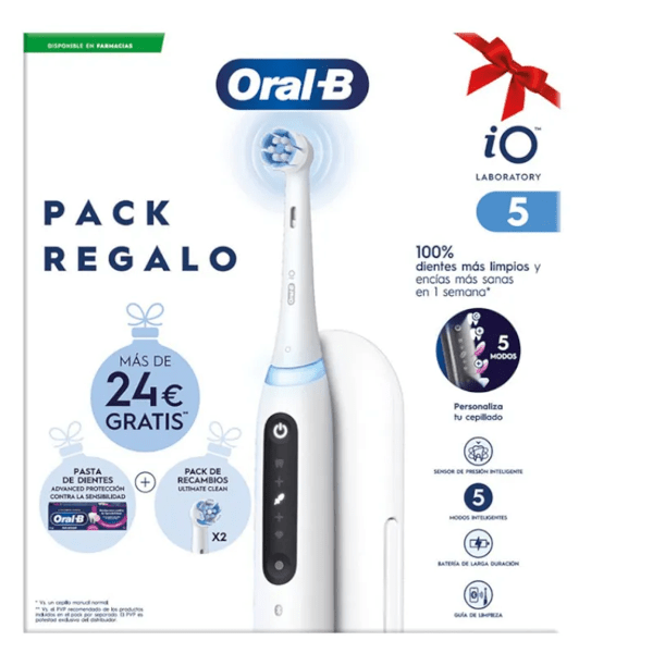https://www.mifarma.eu/oral-b-io-5-electric-toothbrush-gift-pack-white808865691735Oral-B iO 5 Electric Toothbrush Gift Pack White<p><span style="font-weight: bold;">Oral-B iO 5 Electric Toothbrush Gift Pack White</span></p><p> The <span style="font-weight: bold;">Oral-B iO 5</span> electric toothbrush represents the pinnacle of oral care technology, combining an <span style="font-weight: bold;">ergonomic design with a round brush head</span> inspired by professional toothbrushes.</p><p> This innovative system, equipped with <span style="font-weight: bold;">micro-vibrating filaments</span> , provides a cleaning experience that simulates dental care. Thanks to the <span style="font-weight: bold;">smart pressure sensor</span> , the brush alerts the user if they are brushing too hard or too softly, helping to prevent gum damage and maintain safe and effective oral hygiene.</p><p> One of the highlights of the iO 5 is its <span style="font-weight: bold;">AI brushing recognition</span> capability. This feature allows the brush to identify your personal brushing style and offer personalized tips to improve it every day.</p><p> Plus, <span style="font-weight: bold;">it connects to the free Oral-B app</span> , which provides <span style="font-weight: bold;">real-time brushing tracking</span> and guides you through six specific areas of your mouth to ensure no area is left unattended.</p><p> With Oral-B's most advanced technology, this toothbrush <span style="font-weight: bold;">removes 100% more plaque and up to 160% more between teeth compared to a manual toothbrush</span> , ensuring healthier gums in just one week. To maximize cleaning effectiveness, the iO 5 <span style="font-weight: bold;">has five cleaning modes to suit different needs: daily, intense, sensitive, extra sensitive, and whitening</span> .</p><p> The dentist-recommended <span style="font-weight: bold;">2-minute ring light with built-in timer</span> ensures optimal brushing, while the brush head change alert ensures brushing effectiveness is maintained.</p><p></p><p> Finally, the <span style="font-weight: bold;">lithium-ion battery offers a long life</span> , ensuring that the brush is always ready for daily use.</p><p> <span style="font-weight: bold;">This pack includes 2 Oral-B round brush heads plus an Oral-B Advanced Sensitivity 75 ml toothpaste.</span></p><p> With the iO 5, users can enjoy a professional brushing experience in the comfort of their own home, backed by the number one brand used by dentists worldwide.</p>https://assets.atida.com/transform/ecf489d8-41c1-401e-b49f-b1e6ce0573cc/Oral-B-Pack-Regalo-Cepillo-Electrico-iO-5-Blanco?io=transform:extend,width:250,height:25097.99instock129.980.983470074382531.91Oral-Bhttps://www.mifarma.eu/media/catalog/product/3/5/3/a/353a9f9eb218e4df6f99dfbfadb1f9e1912b53a1_Oral_B_Pack_Regalo_Cepillo_Electrico_iO_5_Blanco.png/Health and Hygiene/Dental and Oral Care/Toothbrushes/Health and Hygiene/Health and Hygiene/Dental and Oral Care/Electric Brushes/Gifts/Gifts/Gifts for the Whole Family/NO MIFARMA DAYS/EPIC DAYS: Up to 75% off!/15% off Oral-B2025-10-24T00:10:25+0000