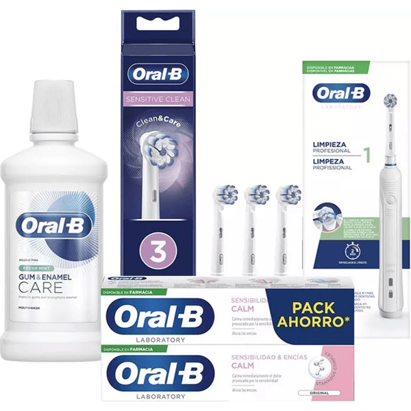 https://www.mifarma.eu/oral-b-tooth-sensitivity-pack635501653423Oral-B Tooth Sensitivity Pack<p>This pack of <span>Oral-B</span> oral care products is especially indicated to help combat <span>tooth sensitivity</span> .</p><p> Contains:</p><p> - <span>Oral-B Rechargeable Toothbrush PRO 1</span> : ideal electric toothbrush to keep your mouth clean and healthy. With a timer that warns every 30 seconds to change the area in the mouth for 2 minutes. Round head, 3D, that moves and reaches all areas, even the most difficult. It removes much more plaque than a manual toothbrush.</p><p> - <span>Oral-B Replacement Brush 3 units</span> : These replacement heads have soft and ultra-fine filaments to offer superior cleaning, and other harder ones that act against plaque. Thanks to their rounded bristles, these heads are ideal for <strong>sensitive teeth</strong> and people with <strong>inflamed gums</strong> .</p><p> - <span>Oral-B Calm Gums & Sensitivity Toothpaste 200 ml</span> : toothpaste indicated for <strong>sensitive teeth</strong> , which soothes pain immediately, prevents hypersensitivity and protects dentin. It has antibacterial action to prevent the appearance of cavities, since it neutralizes the bacteria in the gum line. In this way it also prevents gingival problems.</p><p> - <span>Oral-B Gums and Enamel Care Mouthwash 500 ml</span> : this mouthwash is specially formulated to protect tooth enamel and care for gums. <strong>Alcohol free</strong> . Its fresh mint flavor leaves a pleasant sensation of cleanliness and freshness in the mouth.</p>https://assets.atida.com/transform/170283ce-06ce-4a6b-9ba6-105c12cbd32c/Oral-B-Pack-Sensibilidad-Dental?io=transform:extend,width:250,height:25064.99outofstock71.2353.71074280165396.24Oral-Bhttps://www.mifarma.eu/media/catalog/product/7/7/7/c/777ced9fde1f3e4bcf270bcb1b2063c1ce7927c3_Product_Tile_Thumbnail_Oral_B_Pack_Sensibilidad_Dental.png/Health and Hygiene/Dental and Oral Care/Toothbrushes/Health and Hygiene/Dental and Oral Care/Kits/Health and Hygiene/Dental and Oral Care/Mouthwashes/Health and Hygiene/Dental and Oral Care/Toothpaste/Mini Prices/Savings Packs/Health and Hygiene/Health and Hygiene/Dental and Oral Care/Savings Packs/Health and Hygiene Packs2024-09-16T06:07:27+0000