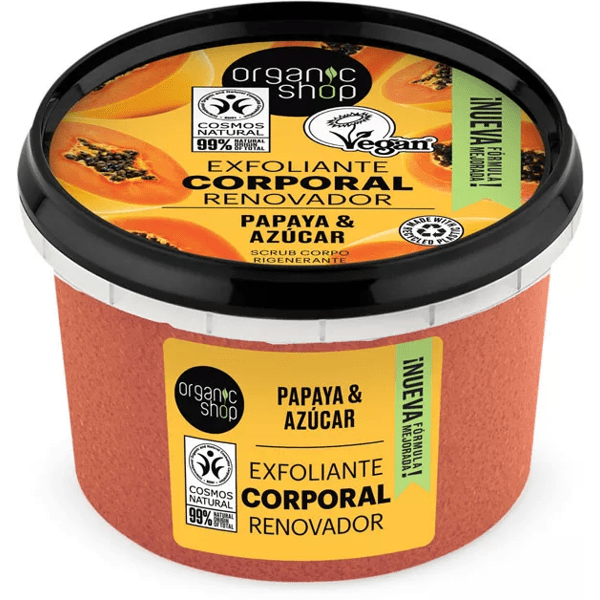 https://www.mifarma.eu/organic-shop-papaya-renewing-body-scrub-250-ml852001940996Organic Shop Papaya Renewing Body Scrub 250 ml<p><span>Gentle body scrub</span> with organic papaya extract and natural sugar.</p><p> It cleanses your skin while rejuvenating it and provides a fruity and sweet aroma.</p><p> It removes dead cells and leaves the skin soft and velvety.</p><p> Suitable for <span>all skin types</span> .</p><p> Formulated with 99% ingredients of natural origin.</p><p> Suitable for <span>vegans</span> .</p>https://assets.atida.com/transform/5fc9d1bb-33d8-4846-8d4a-3f95ea05f5d4/ORGANIC-SHOP-EXFOLIANTE-CORPORAL-RENOVADOR-PAPAYA?io=transform:extend,width:250,height:2504.99instock5.844.1239659421488150.85Organic Shophttps://www.mifarma.eu/media/catalog/product/0/8/f/6/08f65a324476a35466e32cee26ad2f41c22dd007_Product_Tile_Thumbnail_ORGANIC_SHOP_EXFOLIANTE_CORPORAL_RENOVADOR_PAPAYA.png/Cosmetics and Beauty/Cosmetics and Beauty/Natural and Organic Cosmetics/Health and Hygiene/Health and Hygiene/Body Care/Health and Hygiene/Body Care/Moisturization and Exfoliation2024-09-16T06:20:04+0000