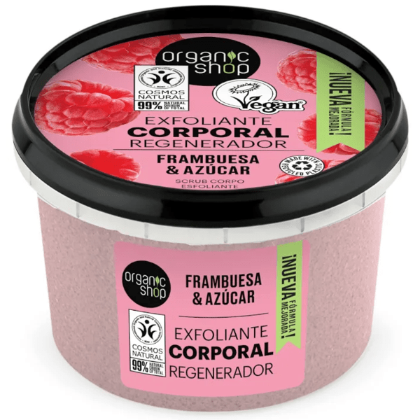 https://www.mifarma.eu/organic-shop-raspberry-regenerating-body-scrub-250-ml413137184626Organic Shop Raspberry Regenerating Body Scrub 250 ml<p>This <span>body scrub</span> contains organic raspberry extract and natural sugar.</p><p> It removes dead skin cells, leaving it free of impurities and providing it with nutrients so that it is always soft and cared for.</p><p> Suitable for <span>all skin types</span> .</p><p> Formulated with 99.54% ingredients of natural origin.</p><p> Suitable for <span>vegans</span> .</p>https://assets.atida.com/transform/25d3f9f6-fe37-4ddf-864e-1d5814153889/Organic-Shop-Exfoliante-Corporal-Regenerador-Frambuesa-250-ml?io=transform:extend,width:250,height:2504.99instock4.994.123965942148800Organic Shophttps://www.mifarma.eu/media/catalog/product/9/8/c/4/98c4f48a56b09826007ee87f8dc08c0486c73921_Organic_Shop_Exfoliante_Corporal_Regenerador_Frambuesa_250_ml.png/Cosmetics and Beauty/Natural and Organic Cosmetics/Health and Hygiene/Health and Hygiene/Body Care/Health and Hygiene/Body Care/Moisturization and Exfoliation/Cosmetics and Beauty2024-09-16T05:56:05+0000